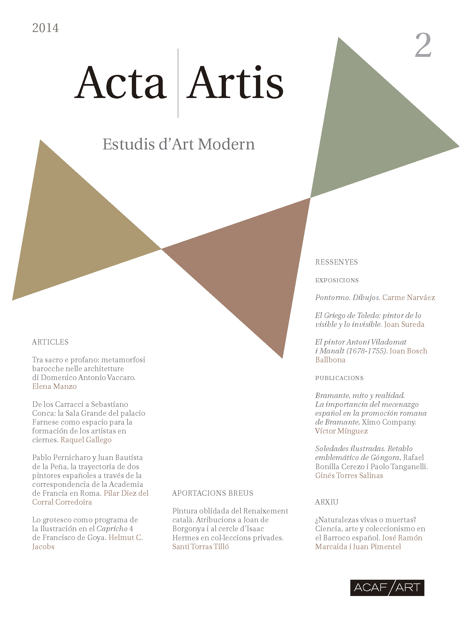 Acta/Artis, revista científica del projecte i grup d’investigació ACAF/ART, enquadrat en el Departament d’Història de l’Art de la Universitat de Barcelona, promou l’estudi, la crítica i el debat en el camp de l’art, l’arquitectura i els processos de creació visual que, prioritàriament –encara que no exclusivament–, es van generar al voltant de la Mediterrània entre els segles XV i XVIII. S’estructura en diversos apartats que recullen articles d’investigació, aportacions breus de caire filològic, anàlisis d’exposicions i publicacions, i un darrer, «Arxiu», recupera figures i contribucions històricament rellevants en el camp dels estudis sobre l’art modern. L’apartat d’articles científics d’aquest número gira entorn de Roma, meta inexcusable per a qualsevol artista de l’època i, des de finals del segle XVII, una de les destinacions més considerades del Grand Tour. Com a lloc seminal del viatge iniciàtic que va ser Roma per als joves pintors, Raquel Gallego estudia l’impacte de la Sala Gran del palau Farnese, i Pilar Diez del Corral analitza l’empremta romana en pintors com Pablo Pernicharo i Juan Bautista de la Peña. Helmut C. Jacobs se centra, d’altra banda, en l’etapa postromana de Francisco de Goya incidint en la presència del grotesc en el seu Capricho 4, mentre que Elena Manzo desplaça el focus d’atenció del fet modern de Roma a Nàpols a través de l’arquitectura del també pintor Domenico Antonio Vaccaro. En l’apartat d’aportacions breus, l’anàlisi filològica de Santi Torras amplia el catàleg d’obres atribuïdes a Joan de Borgonya i al cercle d’Isaac Hermes. «Arxiu» publica un article de José Ramón Marcaida i Juan Pimentel que treu a la llum la naturalesa múltiple del bodegón barroc espanyol.