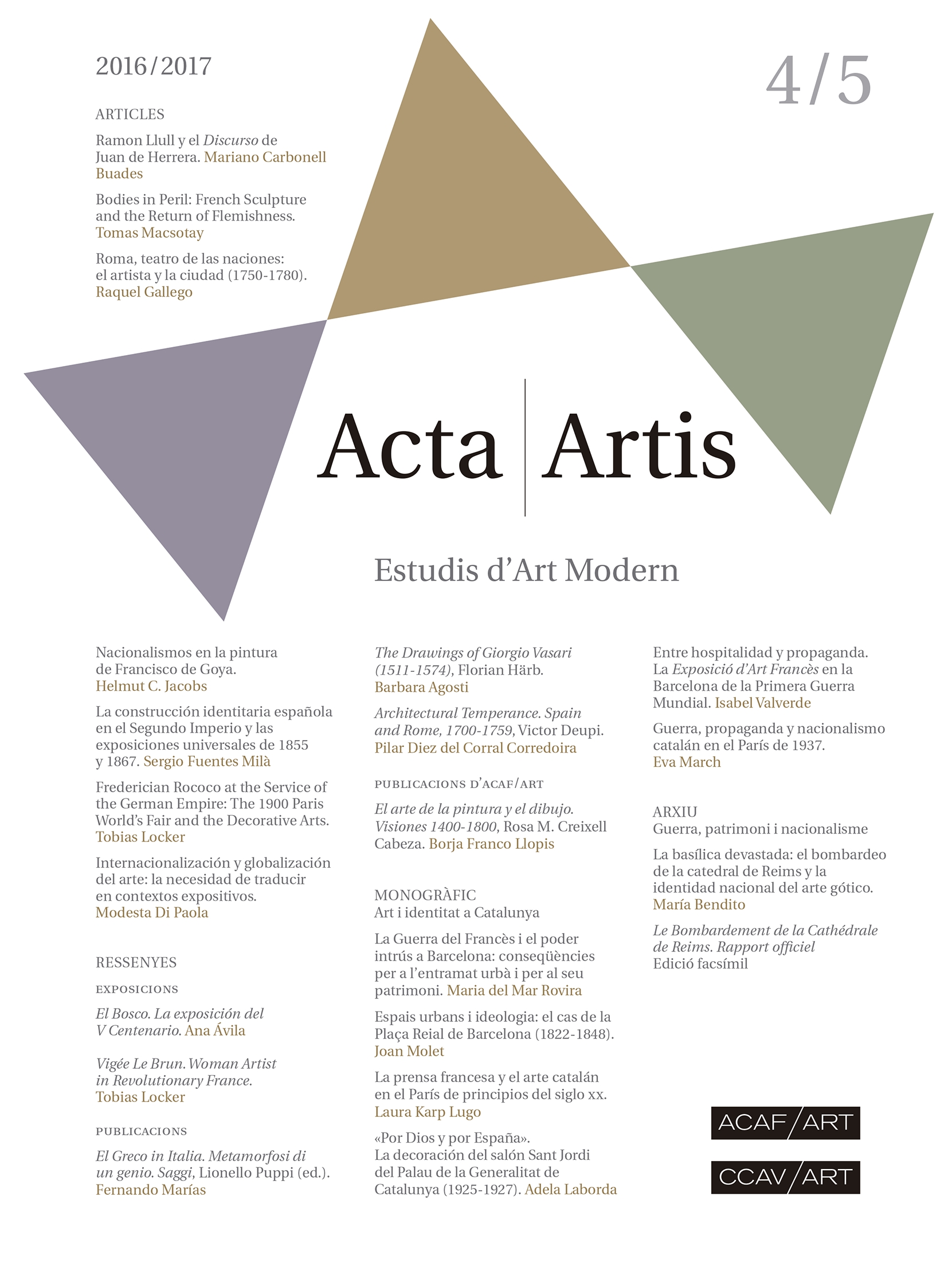 Acta/Artis, revista científica del projecte i grup d’investigació ACAF/ART, enquadrat en el Departament d’Història de l’Art de la Universitat de Barcelona, promou l’estudi, la crítica i el debat en el camp de l’art, l’arquitectura i els processos de creació visual que, prioritàriament –encara que no exclusivament–, es van generar al voltant de la Mediterrània entre els segles XV i XVIII. Aquest volum de la revista inclou dos números: el 4, corresponent a 2016, i el 5, corresponent a 2017. Ha estat plantejat i editat pel projecte ACAF/ART IV («Cartografías críticas, analíticas y selectivas del entorno artístico y monumental del área mediterránea en la edad moderna») en col·laboració amb el projecte CCAV/ART II («Cartografía crítica del arte y la visualidad en la era global») del grup de recerca AGI (Arte, Globalización, Interculturalidad), igualment pertanyent al Departament d’Història de l’Art de la Universitat de Barcelona. Amb la direcció de Carme Narváez i la coordinació d’Eva March i Rosa Creixell, el volum s’estructura en dos cossos d’estudi que recullen articles d’investigació, anàlisis d’exposicions i publicacions, i l’apartat «Arxiu». La recerca presentada en els diferents apartats gira entorn dels debats global/local i identitat col·lectiva / identitat individual, debats que, en la relació entre nacionalisme i poder, es concreten en diferents moments històrics i àmbits territorials. En el primer cos del volum, de caràcter miscel·lani, aquesta relació és investigada per Mariano Carbonell, Tomas Macsotay, Raquel Gallego, Helmut C. Jacobs, Sergio Fuentes, Tobias Locker i Modesta Di Paola, i igualment és plantejada en l’apartat «Arxiu» per María Bendito. El segon cos del volum centra el debat en l’àmbit territorial i cultural català, amb recerques de Maria del Mar Rovira, Joan Molet, Laura Karp, Adela Laborda, Isabel Valverde i Eva March. Les anàlisis d’exposicions i publicacions són dutes a terme per Ana Ávila, Tobias Locker, Fernando Marías, Barbara Agosti, Pilar Diez del Corral i Borja Franco. Acta/Artis és una revista de periodicitat anual. Es publica en paper i en format electrònic (http://revistes.ub.edu/index.php/ActaArtis/). En aquest darrer cas, es permet l’accés gratuït i sense restriccions a tot el contingut. Acta/Artis està registrada i indexada en els repertoris bibliogràfics i les bases de dades nacionals i internacionals següents: carhus+, circ, isoc (cindoc), latindex i miar.