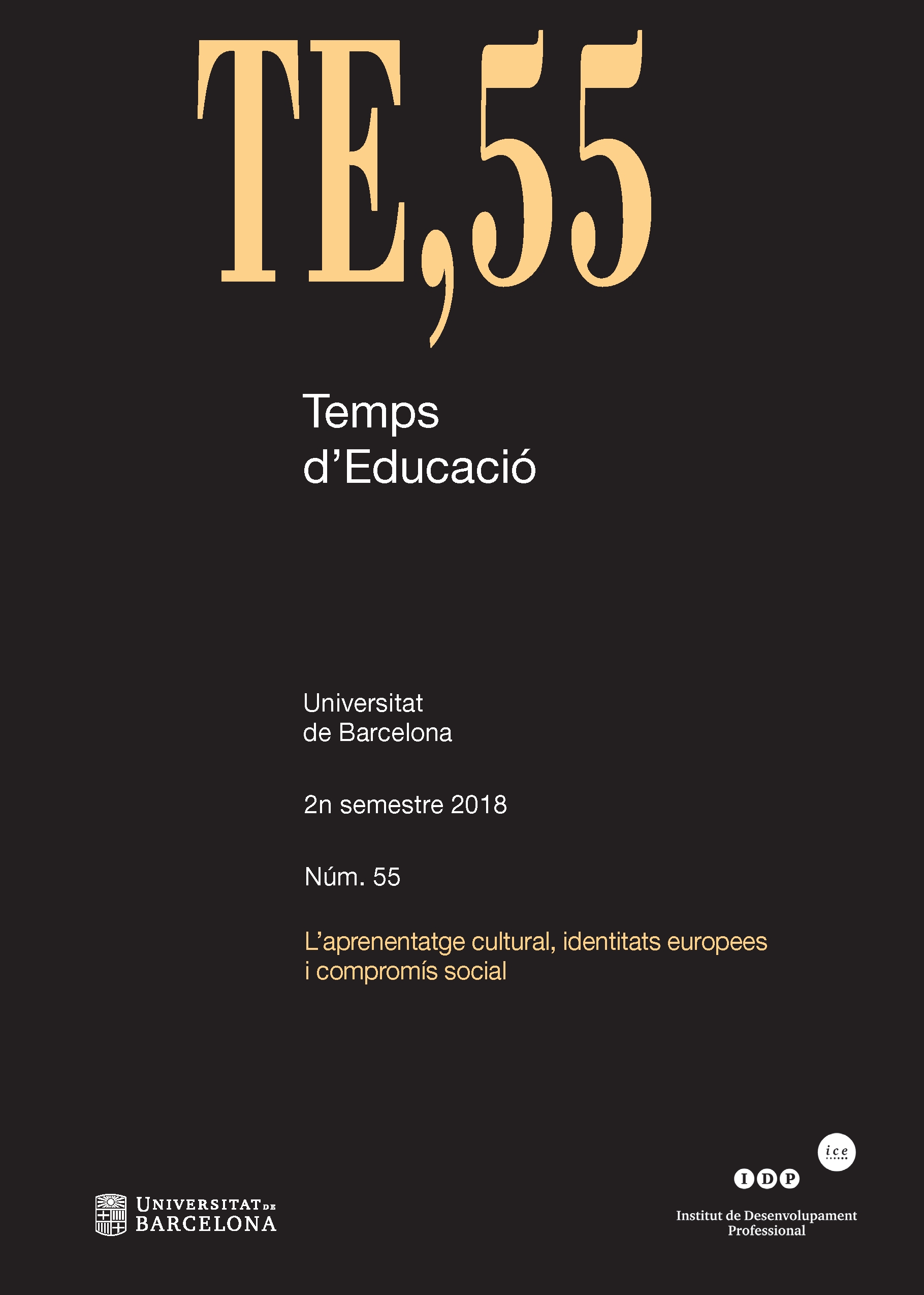 El núm. 55 de Temps d’Educació presenta un monogràfic coordinat per les professores Eulàlia Collelldemont (Universitat de Vic) i Isabel Vilafranca (Universitat de Barcelona) dedicat a «L’aprenentatge cultural, identitats europees i compromís social». A través de les diferents aportacions s’ha pogut desplegar una comprensió de l’evolució de l’aprenentatge cultural durant l’època contemporània que facilita veure «com l’aportació dels pensadors pedagògics i de l’educació han fet possible la integració multicultural d’Europa per tal de construir la identitat europea i possibilitar la convivència pacífica entre els estats». La hipòtesi principal és que sense l’esforç educatiu i l’aportació dels avenços i les innovacions educatives no hagués estat possible la reconstrucció de la pau europea i la instauració de la Unió Europea. Una via pedagògica que, com es comprova al llarg del monogràfic, conté dues dimensions entrellaçades, per bé que no sempre explicitades. Aquestes són les corresponents a la creació de discurs pedagògic i a les materialitzacions que es donen en pràctiques educatives relacionades. El número es completa amb les seccions d'«Estudis i recerques» (amb aportacions de caire antropològic de Miquel Amorós; artístic, amb un article de Ricard Huerta i nous imaginaris escolars de Meritxell Bonàs), de «Testimonis pedagògics» (que inclou les invariants didàctiques de Marian Baqués), de «Textos» (una traducció d’Alexandre Galí sobre un escrit de Dewey) i, finalment, la de «Reflexions i assaigs» aborda qüestions com les relacions entre l’ètica i l’amor romàntic, amb un treball de Juliana Franzi i Ulisses Ferreira, i una aproximació a la plenitud humana de Javier Bermejo.