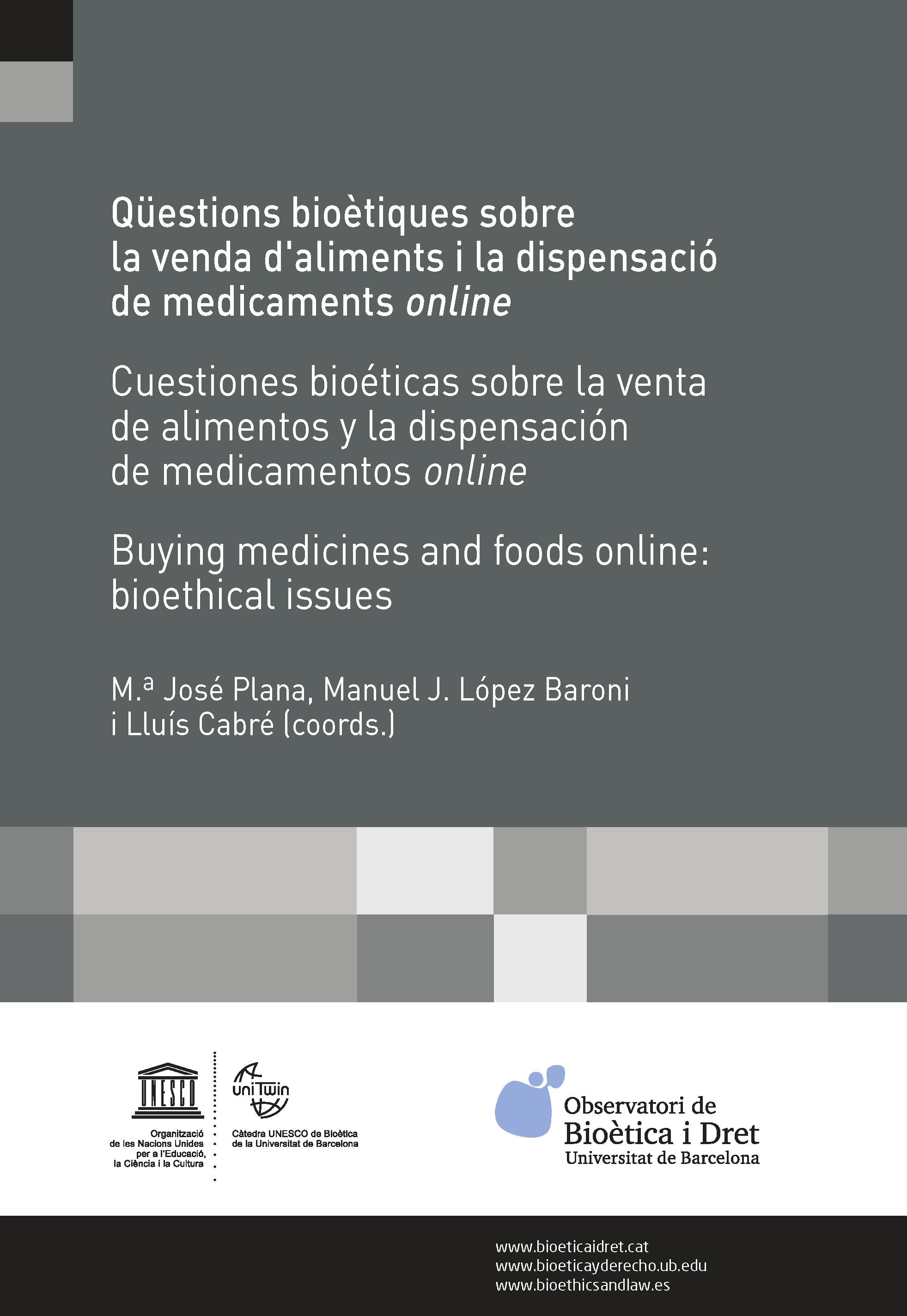 Aquest document de l’Observatori de Bioètica i Dret es proposa identificar problemes bioètics derivats de l’ús d’Internet en el comerç i l’intercanvi d’aliments i medicaments; oferir recomanacions cap a la responsabilitat dels actors implicats (poders públics, plataformes digitals, distribuïdors i ciutadania en general), i fomentar polítiques públiques que s’adeqüin als requisits de seguretat i qualitat.