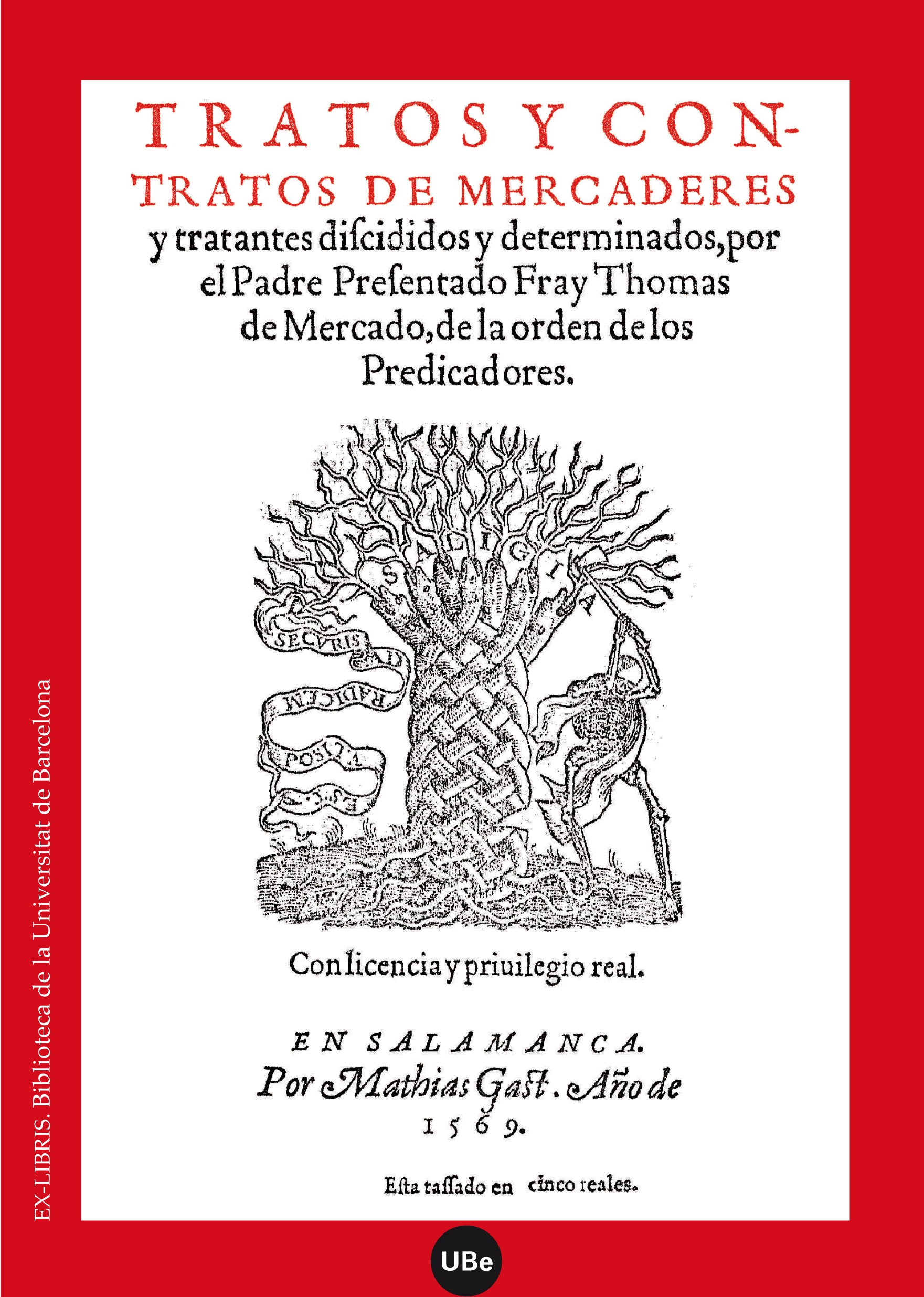 Presentamos el facsímil de la primera edición de la obra del dominico Tomás de Mercado “Tratos y contratos“ impresa en Salamanca en 1569, que fue rápidamente reeditada con el título de “Suma de tratos y contratos“ y traducida al italiano antes de terminar el siglo. Tratado de moralidad mercantil de su época, es una obra pionera en el análisis de las relaciones entre Europa y América a partir de la importación de metales americanos al viejo continente. El ejemplar original se custodia en la Biblioteca de Reserva de la Universidad de Barcelona y presenta en su portada el exlibris de la librería del Convent del Carme de la misma ciudad.