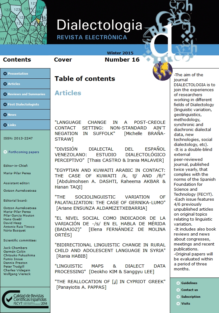 The aim of the journal Dialectologia is to join the experiences of researchers working in different fields of Dialectology (linguistic variation, geolinguistics, methodology, synchronic and diachronic dialectal data, new technologies, social dialectology, etc). It is a double-blind external peer-reviewed journal, published twice yearly, that complies with the norms of the Spanish Foundation for the Science and Technology (FECYT). Each issue publishes 4/5 articles related to a specific subject. It includes also book reviews and news about congresses, meetings and recent publications.
