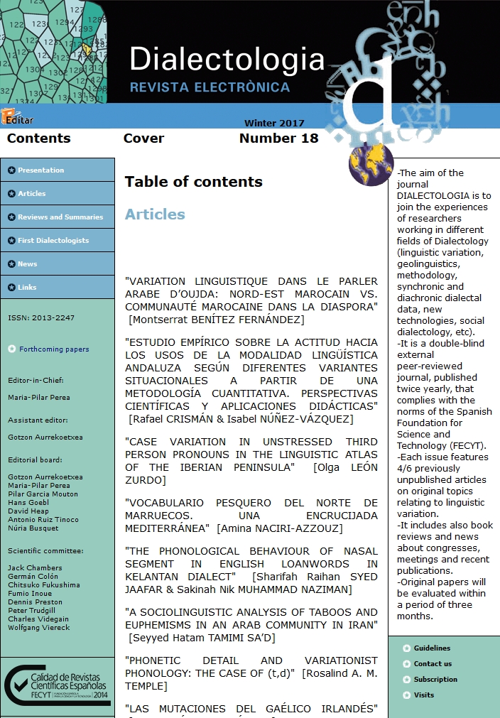 The aim of the journal Dialectologia is to join the experiences of researchers working in different fields of Dialectology (linguistic variation, geolinguistics, methodology, synchronic and diachronic dialectal data, new technologies, social dialectology, etc). It is a double-blind external peer-reviewed journal, published twice yearly, that complies with the norms of the Spanish Foundation for the Science and Technology (FECYT). Each issue publishes 4/5 articles related to a specific subject. It includes also book reviews and news about congresses, meetings and recent publications.