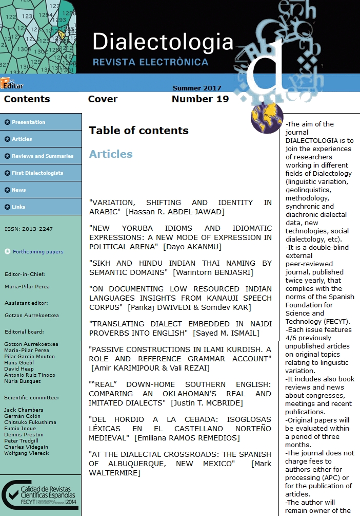 The aim of the journal Dialectologia is to join the experiences of researchers working in different fields of Dialectology (linguistic variation, geolinguistics, methodology, synchronic and diachronic dialectal data, new technologies, social dialectology, etc). It is a double-blind external peer-reviewed journal, published twice yearly, that complies with the norms of the Spanish Foundation for the Science and Technology (FECYT). Each issue publishes 4/5 articles related to a specific subject. It includes also book reviews and news about congresses, meetings and recent publications.