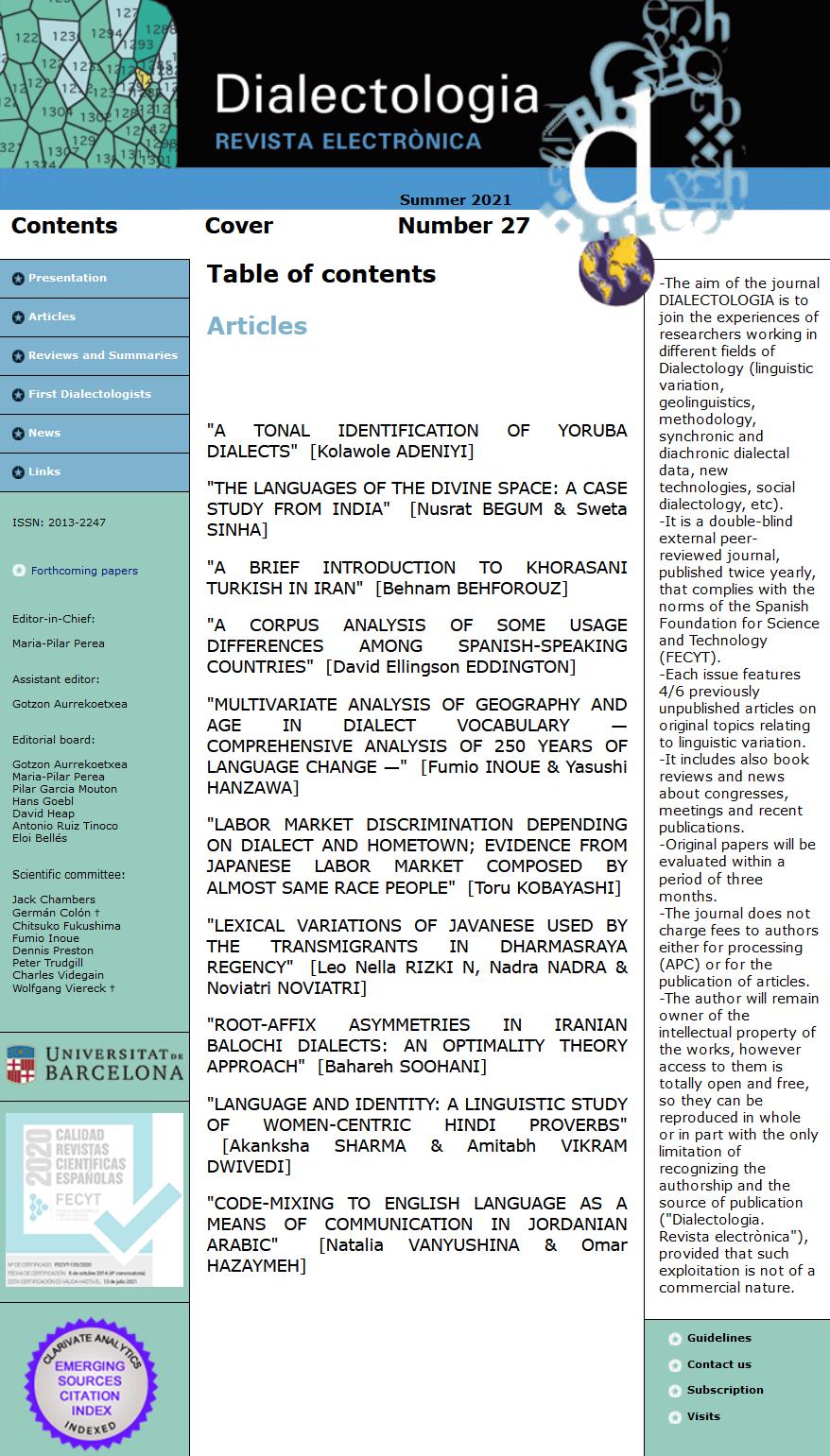 The aim of the journal Dialectologia is to join the experiences of researchers working in different fields of Dialectology (linguistic variation, geolinguistics, methodology, synchronic and diachronic dialectal data, new technologies, social dialectology, etc). It is a double-blind external peer-reviewed journal, published twice yearly, that complies with the norms of the Spanish Foundation for the Science and Technology (FECYT). Each issue publishes 4/5 articles related to a specific subject. It includes also book reviews and news about congresses, meetings and recent publications.