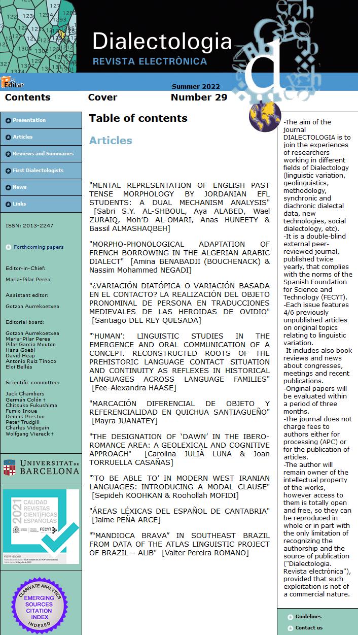 The aim of the journal Dialectologia is to join the experiences of researchers working in different fields of Dialectology (linguistic variation, geolinguistics, methodology, synchronic and diachronic dialectal data, new technologies, social dialectology, etc). It is a double-blind external peer-reviewed journal, published twice yearly, that complies with the norms of the Spanish Foundation for the Science and Technology (FECYT). Each issue publishes 4/5 articles related to a specific subject. It includes also book reviews and news about congresses, meetings and recent publications.