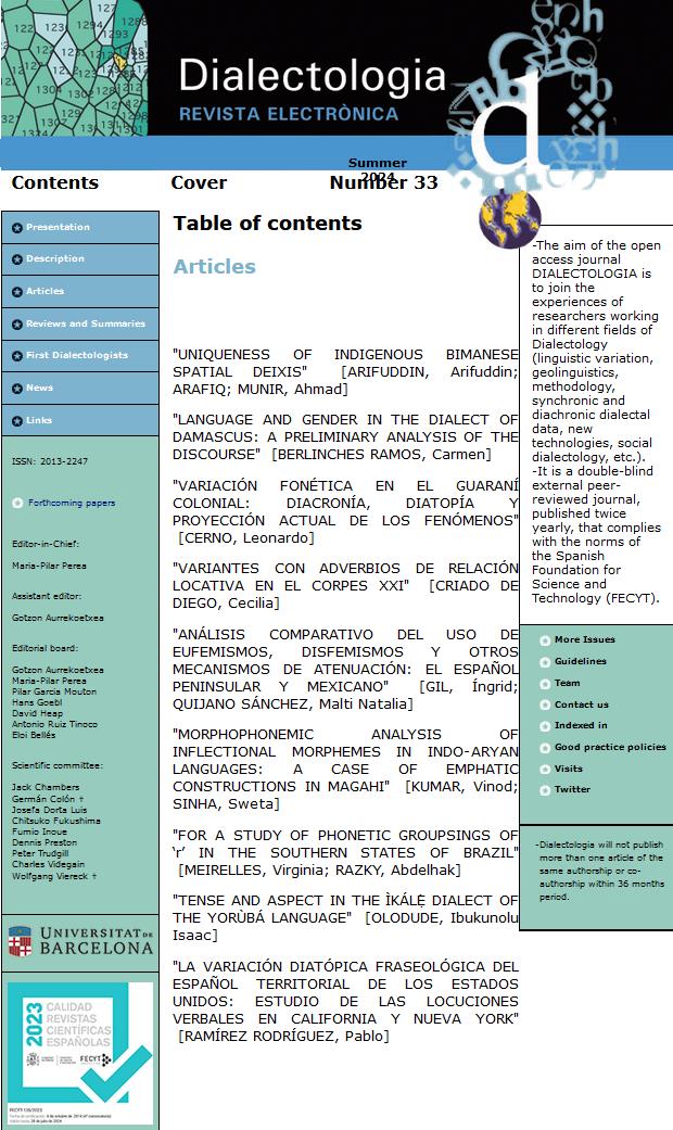 The aim of the journal Dialectologia is to join the experiences of researchers working in different fields of Dialectology (linguistic variation, geolinguistics, methodology, synchronic and diachronic dialectal data, new technologies, social dialectology, etc). It is a double-blind external peer-reviewed journal, published twice yearly, that complies with the norms of the Spanish Foundation for the Science and Technology (FECYT). Each issue publishes 4/5 articles related to a specific subject. It includes also book reviews and news about congresses, meetings and recent publications.