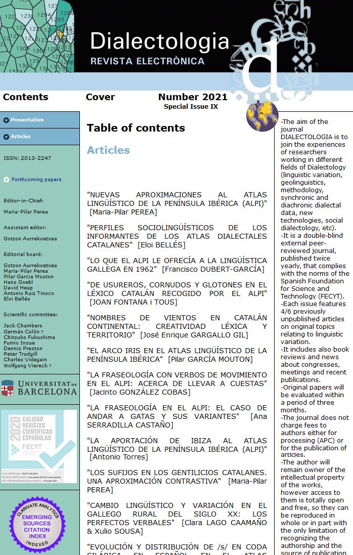 The aim of the journal Dialectologia is to join the experiences of researchers working in different fields of Dialectology (linguistic variation, geolinguistics, methodology, synchronic and diachronic dialectal data, new technologies, social dialectology, etc). It is a double-blind external peer-reviewed journal, published twice yearly, that complies with the norms of the Spanish Foundation for the Science and Technology (FECYT). Each issue publishes 4/5 articles related to a specific subject. It includes also book reviews and news about congresses, meetings and recent publications.
