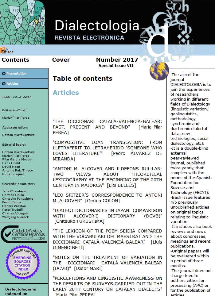 The aim of the journal Dialectologia is to join the experiences of researchers working in different fields of Dialectology (linguistic variation, geolinguistics, methodology, synchronic and diachronic dialectal data, new technologies, social dialectology, etc). It is a double-blind external peer-reviewed journal, published twice yearly, that complies with the norms of the Spanish Foundation for the Science and Technology (FECYT). Each issue publishes 4/5 articles related to a specific subject. It includes also book reviews and news about congresses, meetings and recent publications.