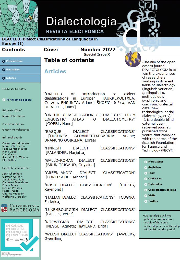 The aim of the journal Dialectologia is to join the experiences of researchers working in different fields of Dialectology (linguistic variation, geolinguistics, methodology, synchronic and diachronic dialectal data, new technologies, social dialectology, etc). It is a double-blind external peer-reviewed journal, published twice yearly, that complies with the norms of the Spanish Foundation for the Science and Technology (FECYT). Each issue publishes 4/5 articles related to a specific subject. It includes also book reviews and news about congresses, meetings and recent publications.