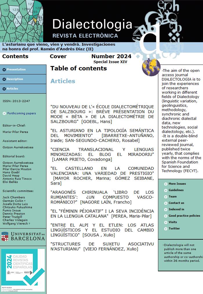 The aim of the journal Dialectologia is to join the experiences of researchers working in different fields of Dialectology (linguistic variation, geolinguistics, methodology, synchronic and diachronic dialectal data, new technologies, social dialectology, etc). It is a double-blind external peer-reviewed journal, published twice yearly, that complies with the norms of the Spanish Foundation for the Science and Technology (FECYT).Each issue features 8/10 previously unpublished articles on original topics relating to linguistic variation.