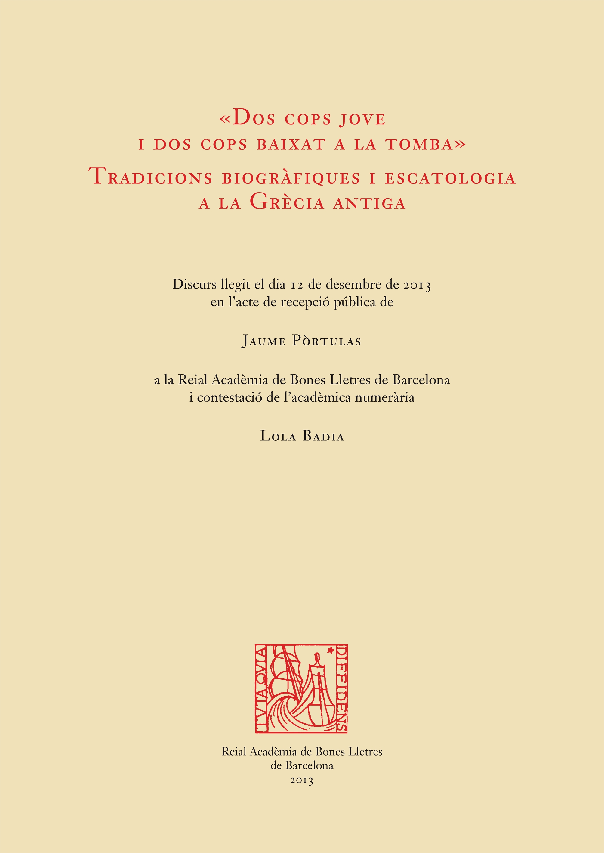 «Dos cops jove i dos cops baixat a la tomba». Tradicions biogràfiques i escatologia a la Grècia antiga és el títol de l’estudi que Jaume Pòrtulas exposà en l’acte d’ingrés a la Reial Acadèmia de Bones Lletres de Barcelona, un treball en què l’autor analitza una sèrie de contalles sobre certs personatges grecs, a cavall entre la llegenda i la història, dels quals s’explica que van gaudir de dues vides. Aquest llibre, que aplega tant l’estudi del flamant acadèmic com les paraules d’elogi al seu antecessor –el professor Joan Bastardas i Parera– i la contestació de Lola Badia, posa de manifest el profund coneixement que té Jaume Pòrtulas de la mitologia i la filologia gregues, així com la brillantor de la seva prosa.