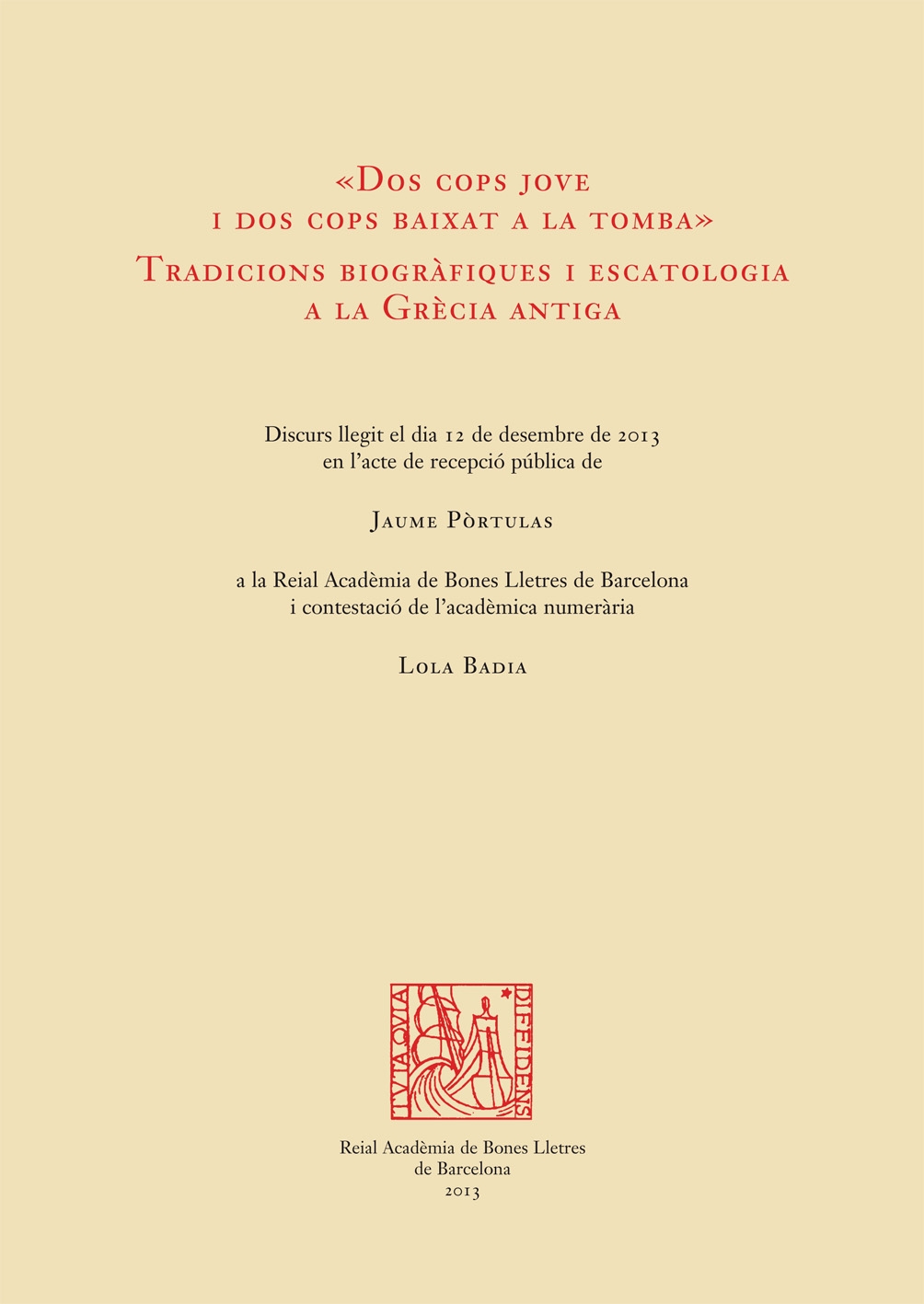 «Dos cops jove i dos cops baixat a la tomba». Tradicions biogràfiques i escatologia a la Grècia antiga és el títol de l’estudi que Jaume Pòrtulas exposà en l’acte d’ingrés a la Reial Acadèmia de Bones Lletres de Barcelona, un treball en què l’autor analitza una sèrie de contalles sobre certs personatges grecs, a cavall entre la llegenda i la història, dels quals s’explica que van gaudir de dues vides. Aquest llibre, que aplega tant l’estudi del flamant acadèmic com les paraules d’elogi al seu antecessor –el professor Joan Bastardas i Parera– i la contestació de Lola Badia, posa de manifest el profund coneixement que té Jaume Pòrtulas de la mitologia i la filologia gregues, així com la brillantor de la seva prosa.