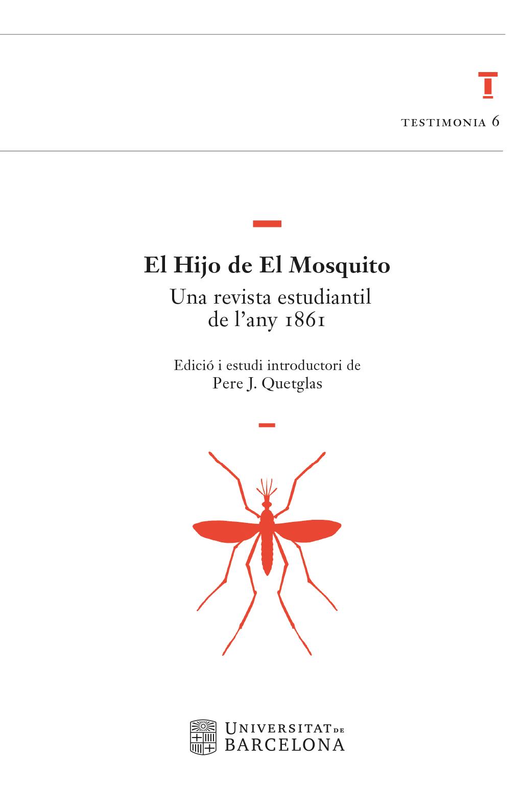 A les pàgines del llibret que teniu a les mans hi trobareu articles, anècdotes, poemes, il·lustracions, passatemps..., els continguts diversos d’una revista manuscrita que van crear, fa més de 150 anys, un grup d’estudiants de l’Institut d’Educació Secundària de Barcelona, quan compartia seu amb la Universitat de Barcelona a l’antic convent del Carme. Entre els temes que s’hi tracten, abunden les crítiques als professors i a l’estat ruïnós de l’edifici, així com les crides a favor de l’enderrocament de les restes de les muralles. Aquest volum inclou la col·lecció completa de la revista i, també, l’únic número d’una publicació anterior, El Mosquito Estudiantil, de la qual El Hijo de El Mosquito és la continuació. És, sens dubte, una feliç coincidència el fet que aquesta edició aparegui precisament ara que l’antiga Facultat de Filosofia i Lletres de la UB s’ha convertit en Facultat de Filologia i Comunicació.