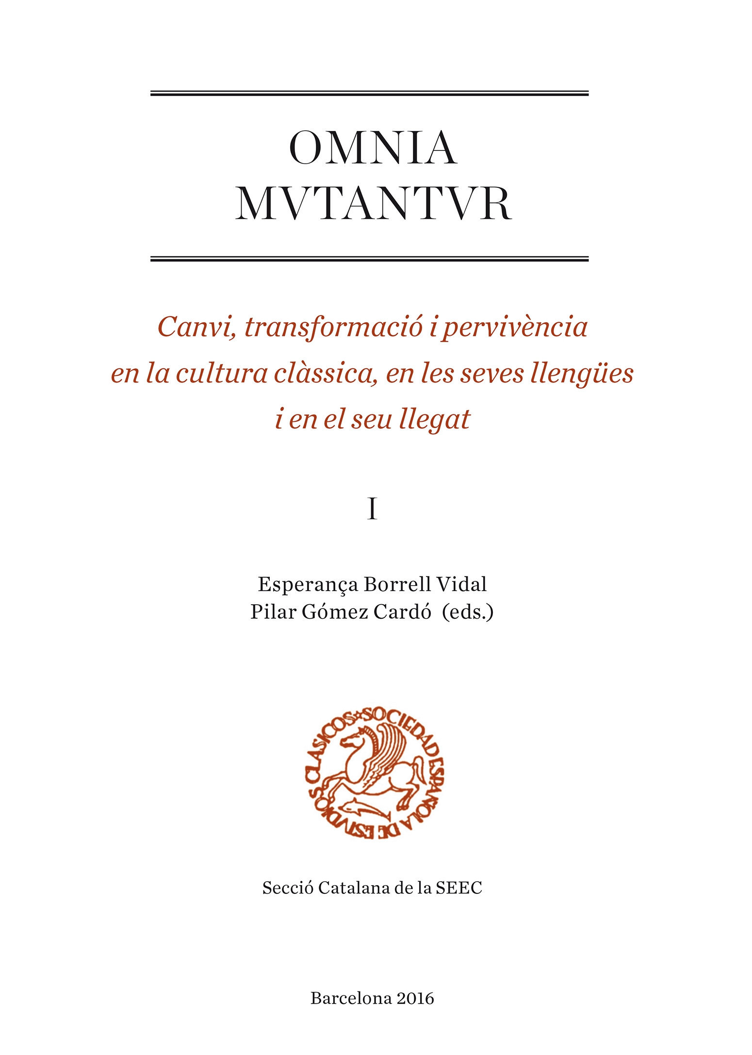 Els dos volums d’Omnia mutantur apleguen algunes de les contribucions que, focalitzades en la cultura, la literatura, la llengua i la civilització de la Grècia i la Roma antigues, així com en la seva pervivència, es presentaren en el decurs d’unes jornades celebrades a la Universitat de Barcelona el juliol de 2013. El fil conductor dels articles que componen els llibres és el concepte de canvi i la capacitat d’adaptació dels antics a noves circumstàncies i nous contextos socials, culturals, intel·lectuals i lingüístics, fet que permet reconèixer també la vigència de l’Antiguitat grega i romana. Aquest primer volum, dedicat al món hel·lènic, conté vint-i-sis articles agrupats al voltant de dos eixos temàtics: literatura i tradició clàssica, d’una banda, filologia i lingüística, de l’altra. Omnia mutantur vol ser un instrument útil per als filòlegs i estudiosos del món antic, i alhora contribuir a la difusió i continuïtat de la tasca que es realitza en aquest camp del coneixement.