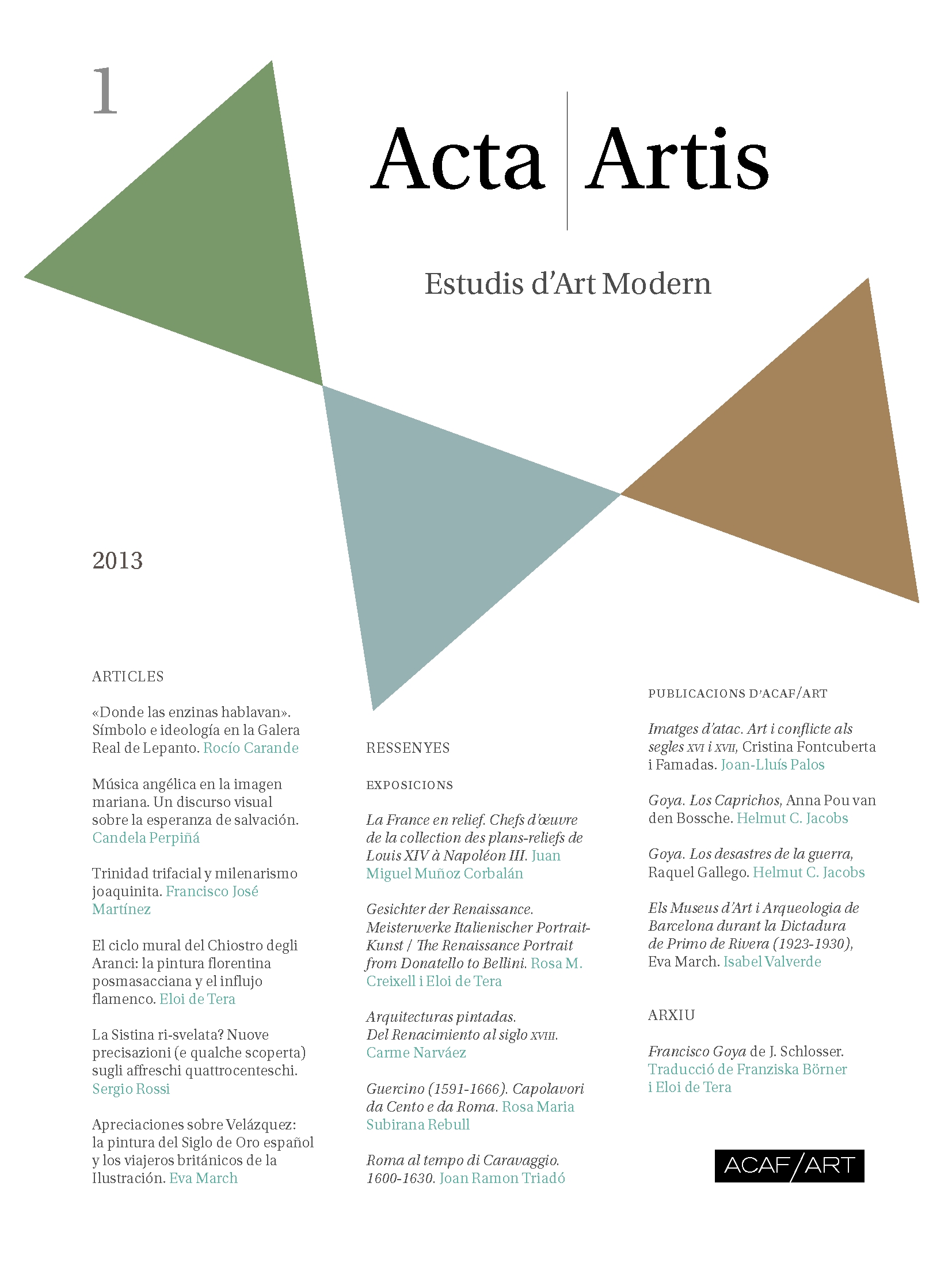 Acta/Artis, revista científica del projecte i grup d’investigació ACAF/ART, enquadrat en el Departament d’Història de l’Art de la Universitat de Barcelona, promou l’estudi, la crítica i el debat en el camp de l’art, l’arquitectura i els processos de creació visual que, prioritàriament —encara que no exclusivament—, es van generar al voltant de la Mediterrània entre els segles XV i XVIII. S’estructura en tres apartats: el primer, d’articles d’investigació; el segon, d’anàlisi d’exposicions i publicacions, i el tercer, «Arxiu», recupera figures i aportacions històricament rellevants en el camp dels estudis sobre l’art modern.