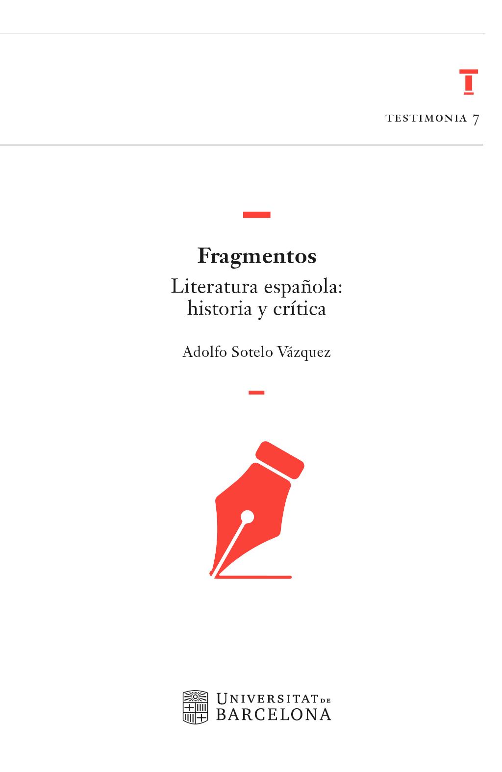 Fragmentos reúne doce estudios escritos entre 1985 y 2022, más de treinta años que representan la vida docente e investigadora del profesor Adolfo Sotelo Vázquez. En sus páginas se abordan temas tan diversos como la personalidad de Francisco Giner de los Ríos y Marcelino Menéndez Pelayo, la relación de La Regenta con la ópera, la labor crítica de Emilia Pardo Bazán, la faceta de ensayista de Miguel de Unamuno o la obra de Federico García Lorca, Camilo José Cela y Carmen Martín Gaite, entre otros autores. La obra recorre, de 1868 a finales del siglo pasado, aspectos clave de la historia de la literatura española, pautada a menudo desde el diapasón de las literaturas comparadas.