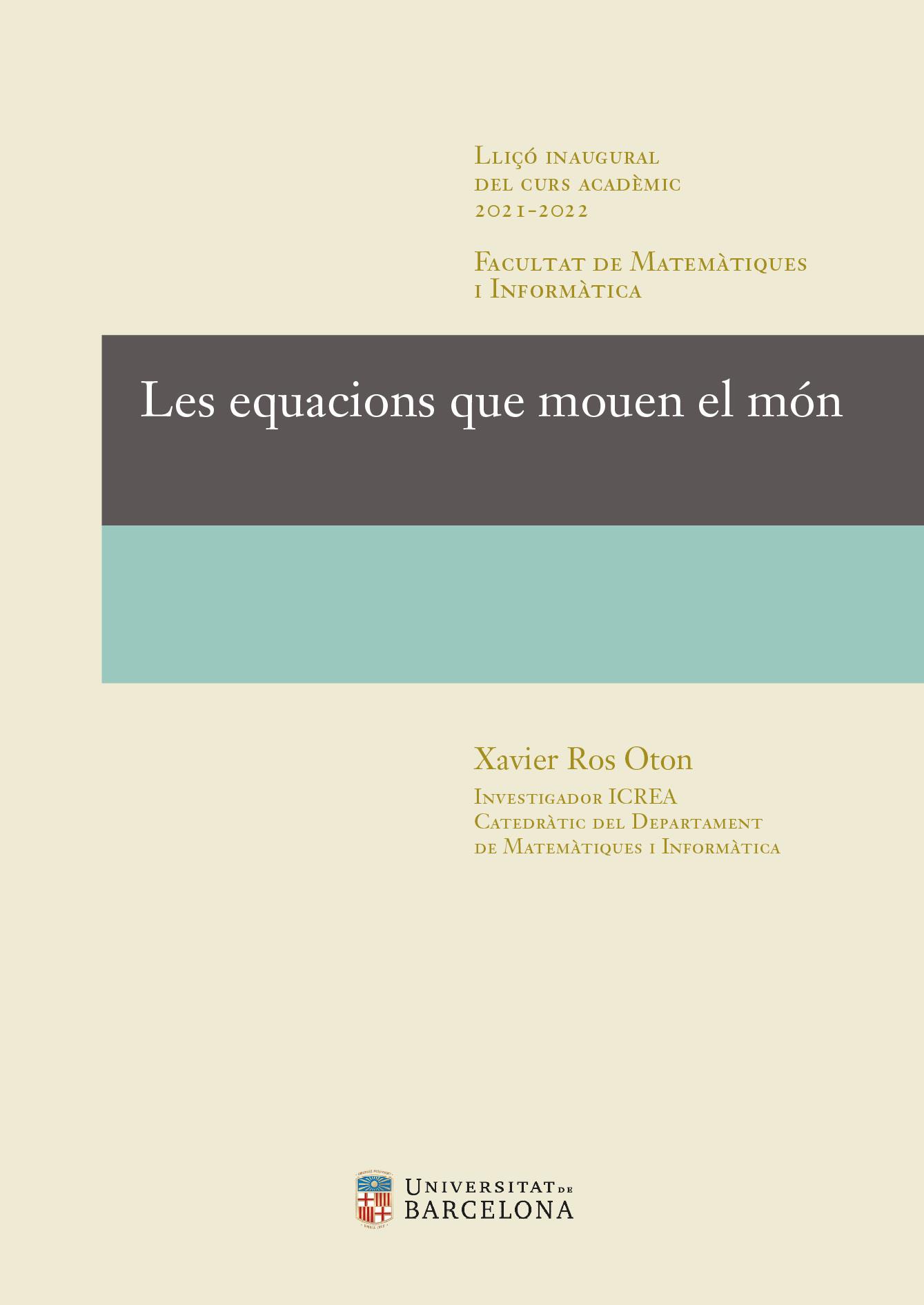 La lliçó inaugural de la Facultat de Matemàtiques és obra de Xavier Ros Oton, investigador ICREA i catedràtic del Departament de Matemàtiques i Informàtica de la Universitat de Barcelona. En el seu discurs tracta les equacions en derivades parcials (EDP), omnipresents en gairebé totes les ciències i enginyeries. Aquest tipus d’equacions regeixen fenòmens tan diversos com la difusió de la calor, les turbulències dels avions, les bombolles de sabó, els mercats financers o la mecànica quàntica. Des del punt de vista matemàtic, l’estudi de les EDP és un camp d’investigació molt actiu, divers i relativament jove. No només té moltes connexions amb altres ciències, sinó també amb altres branques de les matemàtiques com la geometria i la probabilitat. Fins i tot van tenir un paper clau en la demostració que Perelman va fer de la conjectura de Poincaré. L’autor dona una visió general d’aquest camp i explica breument les principals qüestions a què s’enfronten actualment els matemàtics.