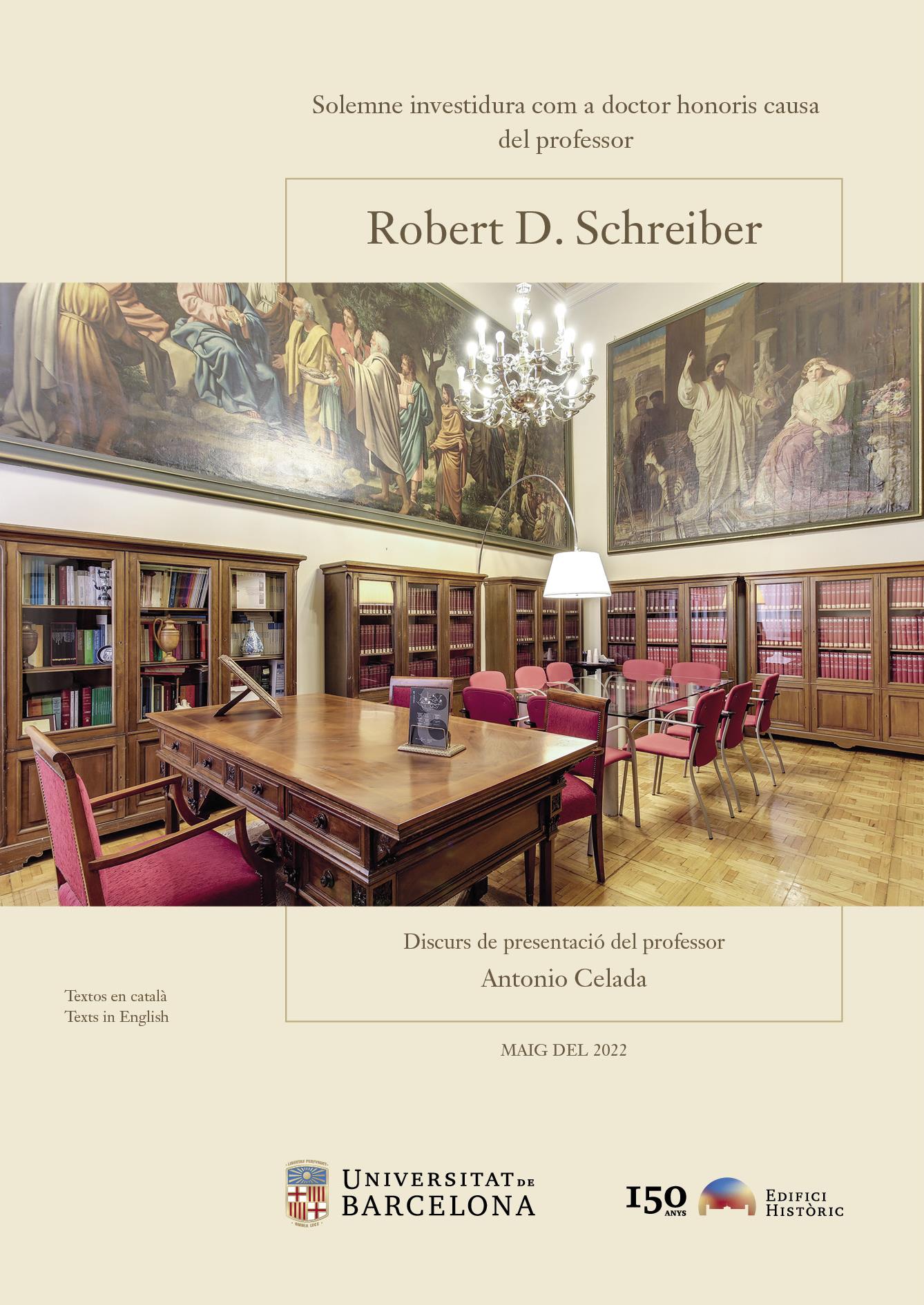 Discurs de l’acte solemne d’investidura acadèmica de conferiment del grau de doctor honoris causa a Robert D. Schreiber, professor del Departament de Patologia i Immunologia de la Universitat de Washington (Estats Units). El professor Antonio Celada introdueix la seva trajectòria acadèmica, amb contribucions decisives en la demostració que el sistema immunitari pot ser una arma terapèutica en l’erradicació del càncer.