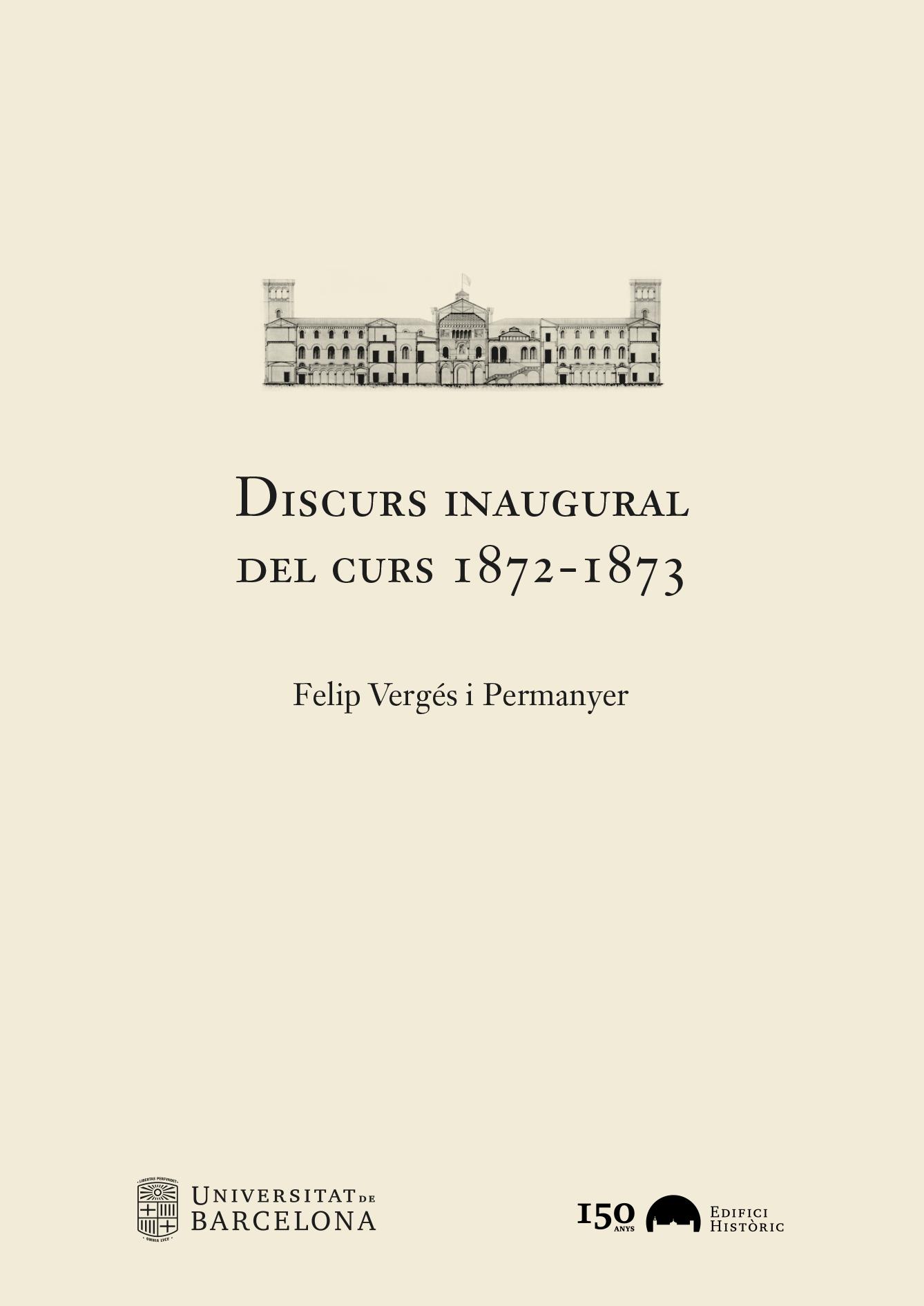 L’1 d’octubre de 1872 es va fer el primer acte d’inauguració de curs acadèmic de la Universitat de Barcelona a l’Edifici Històric, en un moment en què la ciutat i el país vivien un període revolucionari: aquell curs es va iniciar sota el regnat d’Amadeu I de Savoia i es va cloure amb la Primera República. El rector de la Universitat, Antoni Bergnes de las Casas —catedràtic de grec, poliglot, lliurepensador i progressista—, encarregà el discurs al degà de Dret, Felip Vergés i Permanyer, el qual hi va descriure el difícil retorn de la Universitat a Barcelona després del seu desterrament a Cervera el 1714 i hi glossà els elements més destacats de la nova seu, obra de l’arquitecte Elies Rogent. Tot i els avenços,