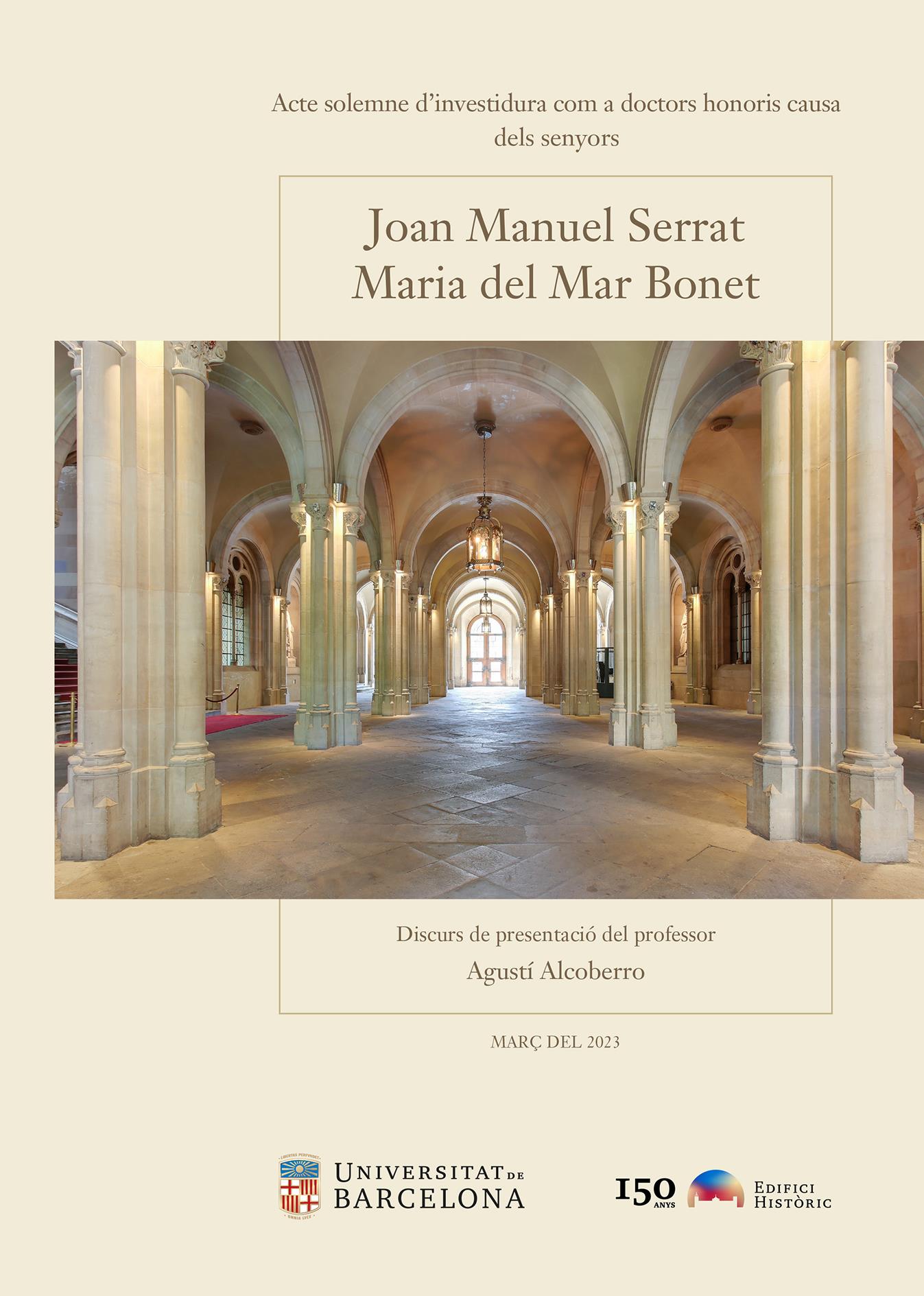 Discurs de l’acte solemne d’investidura acadèmica de conferiment del grau de doctors honoris causa als músics Joan Manuel Serrat i Maria del Mar Bonet per haver contribuït de manera decisiva, a través del grup musical Els Setze Jutges, a la renovació de la música popular catalana en el marc de la lluita per la recuperació de la llengua i la cultura i contra el franquisme. El professor Agustí Alcoberro hi destaca l’excel·lència i el ressò de les seves trajectòries com a renovadors del cançoner popular, bastint un univers artístic propi i musicant grans poetes.