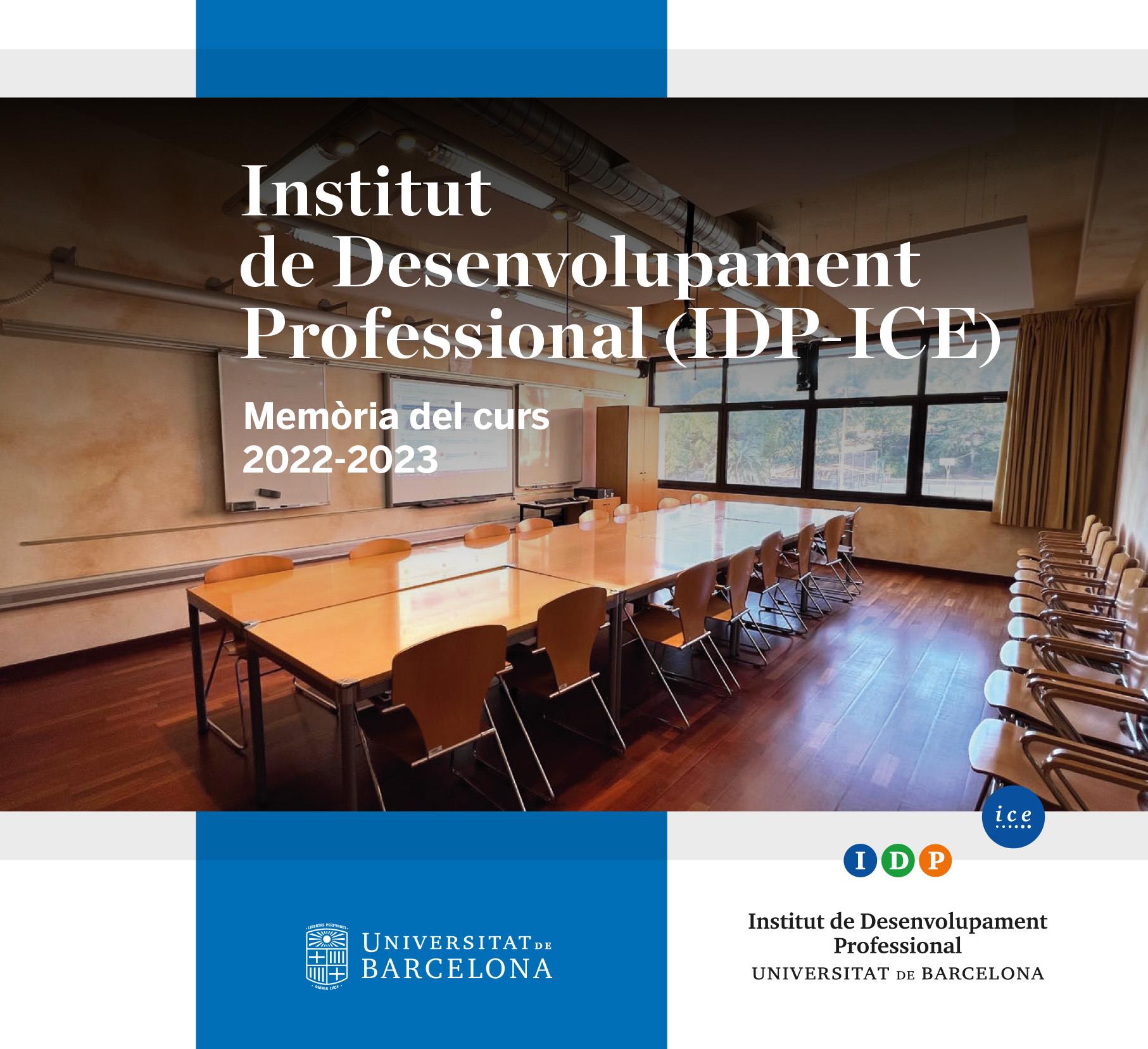 L’Institut de Desenvolupament Professional (IDP-ICE) és, des de fa més de cinquanta anys, una institució de referència de la Universitat de Barcelona en la formació permanent del professorat i dels professionals en general. La memòria d’activitats del curs 2022-2023 ofereix una visió completa i detallada dels assoliments, desafiaments i projeccions de l’Institut, que consoliden el seu compromís d’atansar-se a la missió corporativa: optimitzar la pràctica professional i social a través de la formació permanent, la innovació i la recerca. En la memòria es detallen, per seccions, les línies d’actuació de l’IDP-ICE: cursos, seminaris, assessoraments, jornades, congressos, simposis, grups de treball, programes propis i projectes internacionals desenvolupats en col·laboració amb altres centres, unitats i serveis de la Universitat de Barcelona, així com convenis amb institucions externes per acreditar les activitats formatives. També es fa referència a les publicacions derivades de les activitats dutes a terme i a la tasca de la càtedra de Neuroeducació. A més de fer balanç i retre comptes, aquest document mostra el resultat de l’esforç de l’equip humà —tant les persones internes com els col·laboradors externs—, que ha estat clau, juntament amb el suport de les unitats de govern i transversals de la Universitat de Barcelona i del Departament d’Educació de la Generalitat de Catalunya, per al compliment exitós dels objectius programàtics del curs 2022-2023.