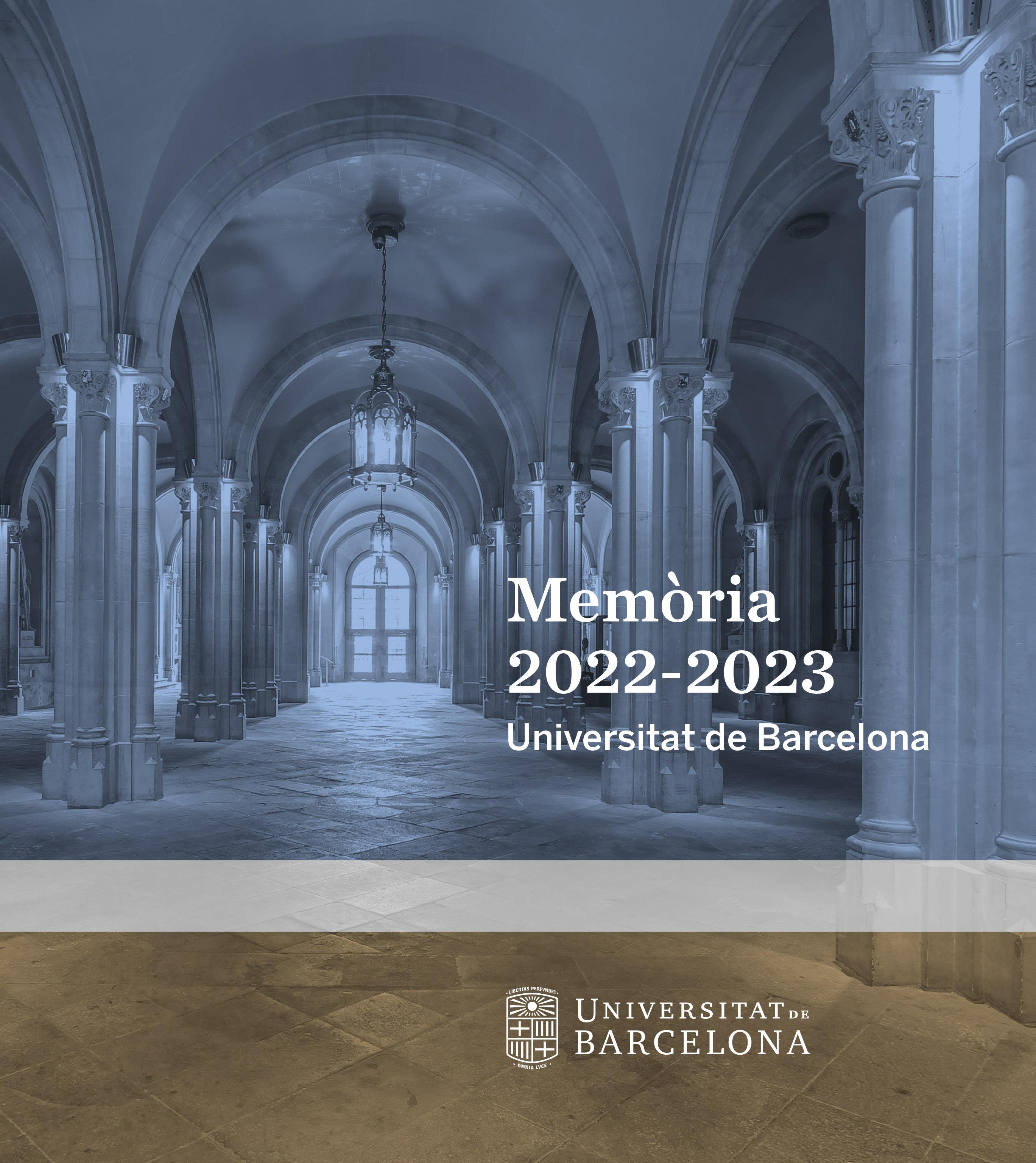 La Memòria de la Universitat de Barcelona presenta les principals activitats del curs acadèmic 2022-2023 i el conjunt d’iniciatives, dades i resultats més remarcables que ha assolit la institució. S’hi destaca el més rellevant dels àmbits de la docència, la recerca, la transferència, les activitats que centren la vida universitària dels estudiants, així com la projecció de la UB en la societat i en el món.