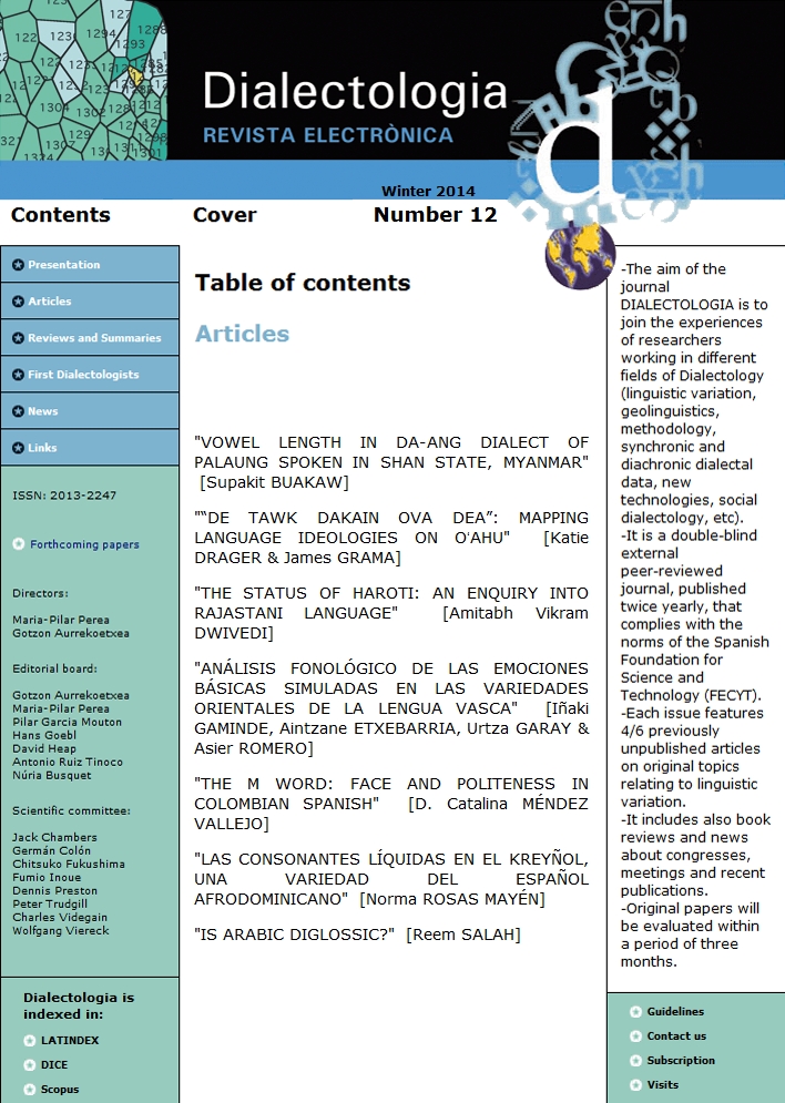 The aim of the journal Dialectologia is to join the experiences of researchers working in different fields of Dialectology (linguistic variation, geolinguistics, methodology, synchronic and diachronic dialectal data, new technologies, social dialectology, etc). It is a double-blind external peer-reviewed journal, published twice yearly, that complies with the norms of the Spanish Foundation for the Science and Technology (FECYT). Each issue publishes 4/5 articles related to a specific subject. It includes also book reviews and news about congresses, meetings and recent publications.