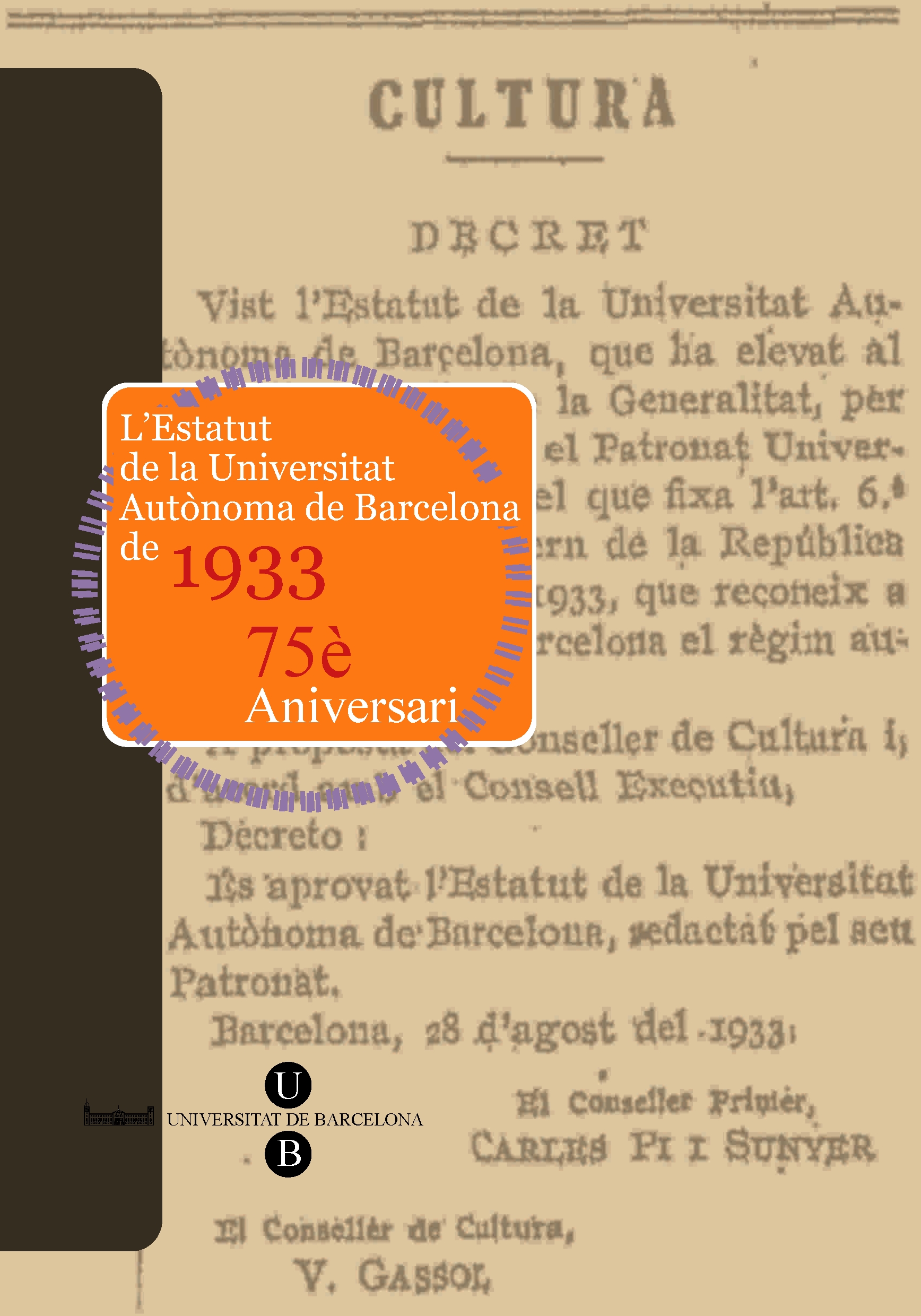 En el setanta-cinquè aniversari de l’Estatut de la Universitat Autònoma de Barcelona de 1933, quan la Universitat de Barcelona va esdevenir autònoma, s’ha editat aquesta publicació que recull la reproducció de diversos textos i documents relacionats amb l’Estatut i la seva curta vida, una il·lusionant experiència d’autonomia universitària, fallida, finalment, per la guerra civil.