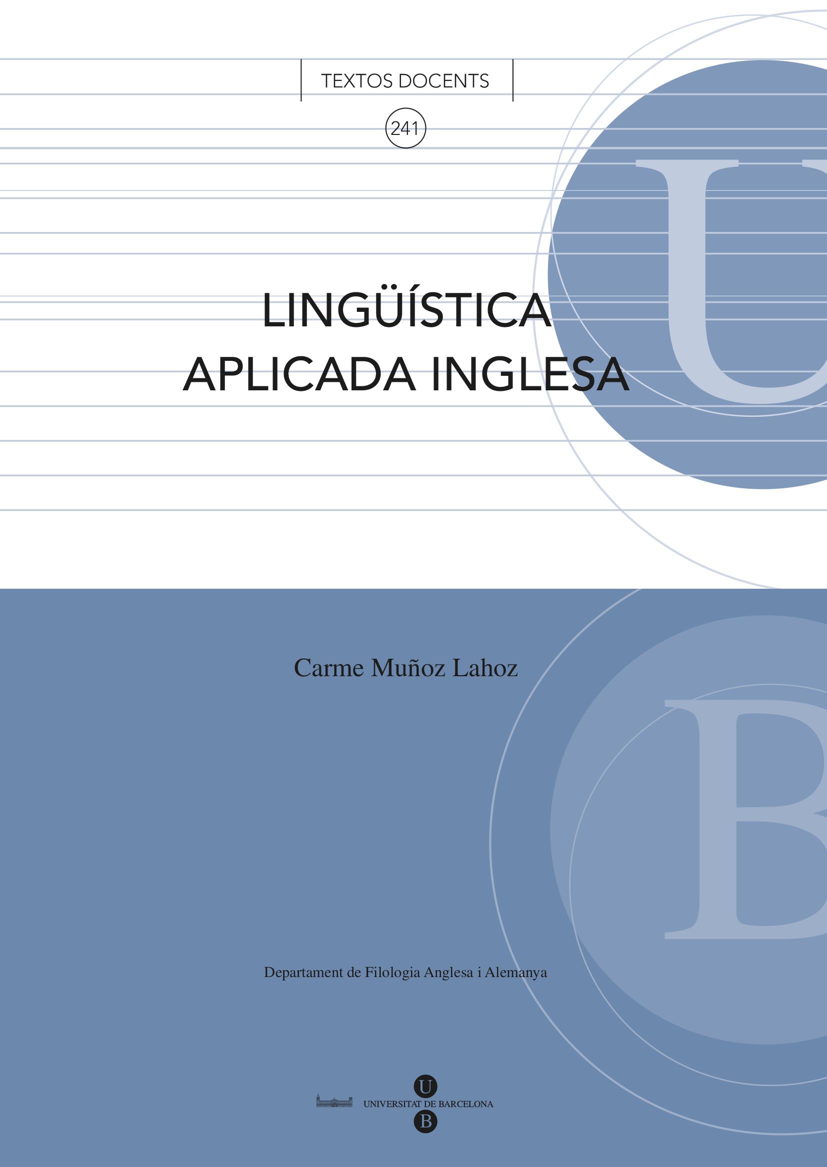 The subject "Lingüística aplicada anglesa" offers an overview of the field of Applied Linguistics and introduces those areas which are both of special interest for English Philology students and which present more vitality at the moment. Some of them have a psycholinguistic orientation, such as First Language Acquisition, Bilingualism, Second Language Acquisition and Use, Language Processing, and Language Disorders and Impairment, while Some are more concerned with social and educational issues, such as Multilingualism and Language Planning.