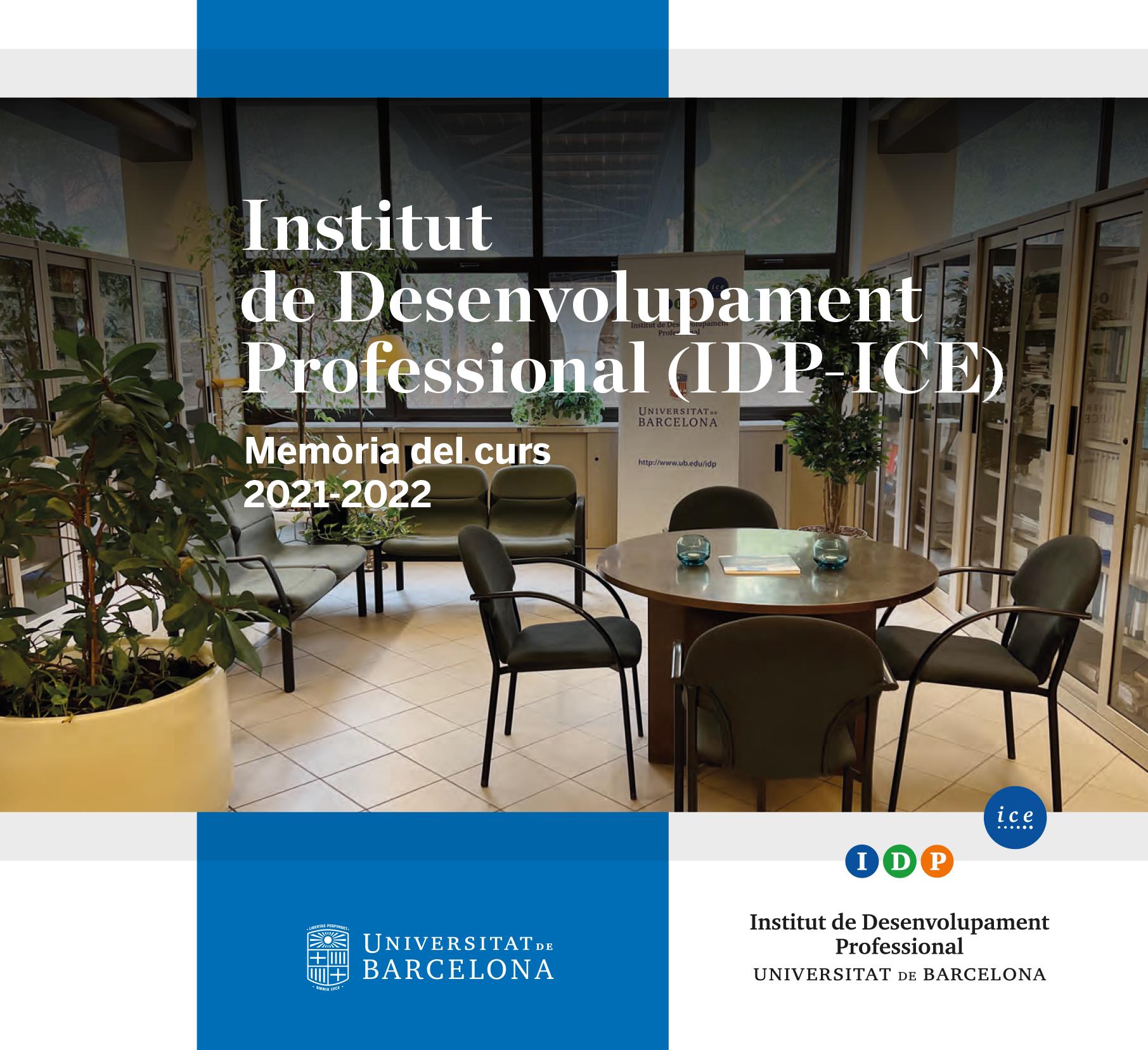 Fundat el 1969, l’Institut de Desenvolupament Professional (IDP-ICE) és una institució de referència de la Universitat de Barcelona en la formació continuada del professorat i dels professionals en general. Aquesta memòria en recull les activitats desenvolupades durant el curs 2021-2022, marcat per la recuperació de la presencialitat, però també per la reflexió profunda, arran de la pandèmia de COVID-19, sobre les diferents modalitats de formació. Distribuïdes per les diverses seccions de l’Institut, les línies d’actuació que s’hi exposen són molt variades: cursos, seminaris, assessoraments, jornades, congressos, simposis, grups de treball, programes propis i projectes internacionals, activitats en col·laboració amb altres centres, unitats i serveis de la Universitat de Barcelona, convenis amb institucions externes, publicacions derivades de les activitats dutes a terme, així com la càtedra de Neuroeducació.