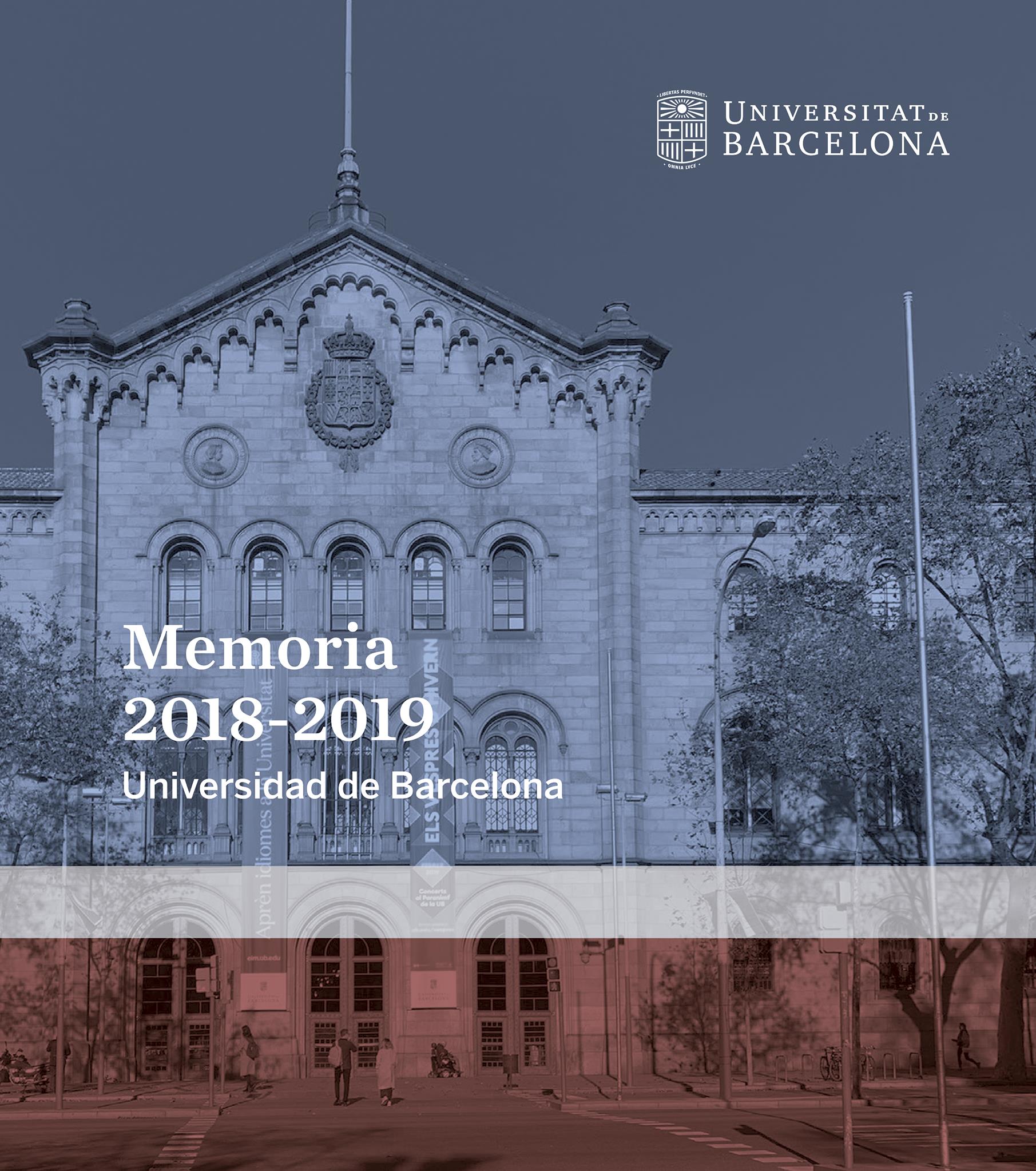 La Memoria de la Universidad de Barcelona presenta las principales actividades del curso académico 2018-2019 y el conjunto de iniciativas, datos y resultados más destacables que ha alcanzado la institución. Se destaca lo más relevante de los ámbitos de la docencia, la investigación, la transferencia, las actividades que centran la vida universitaria de los estudiantes, así como la proyección de la UB en la sociedad y en el mundo.