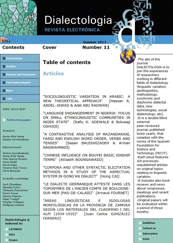 The aim of the journal Dialectologia is to join the experiences of researchers working in different fields of Dialectology (linguistic variation, geolinguistics, methodology, synchronic and diachronic dialectal data, new technologies, social dialectology, etc). It is a double-blind external peer-reviewed journal, published twice yearly, that complies with the norms of the Spanish Foundation for the Science and Technology (FECYT). Each issue publishes 4/5 articles related to a specific subject. It includes also book reviews and news about congresses, meetings and recent publications.