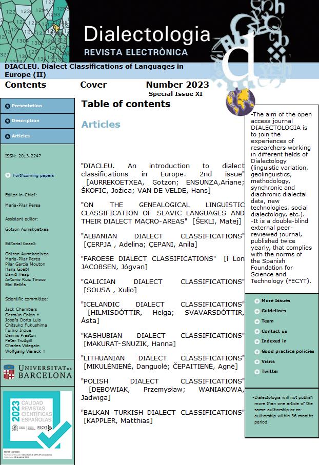 The aim of the journal Dialectologia is to join the experiences of researchers working in different fields of Dialectology (linguistic variation, geolinguistics, methodology, synchronic and diachronic dialectal data, new technologies, social dialectology, etc). It is a double-blind external peer-reviewed journal, published twice yearly, that complies with the norms of the Spanish Foundation for the Science and Technology (FECYT). Each issue publishes 4/5 articles related to a specific subject. It includes also book reviews and news about congresses, meetings and recent publications.
