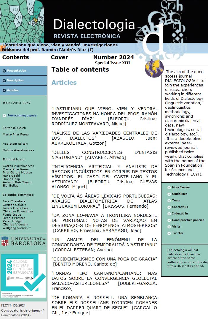 The aim of the journal Dialectologia is to join the experiences of researchers working in different fields of Dialectology (linguistic variation, geolinguistics, methodology, synchronic and diachronic dialectal data, new technologies, social dialectology, etc). It is a double-blind external peer-reviewed journal, published twice yearly, that complies with the norms of the Spanish Foundation for the Science and Technology (FECYT).Each issue features 8/10 previously unpublished articles on original topics relating to linguistic variation.