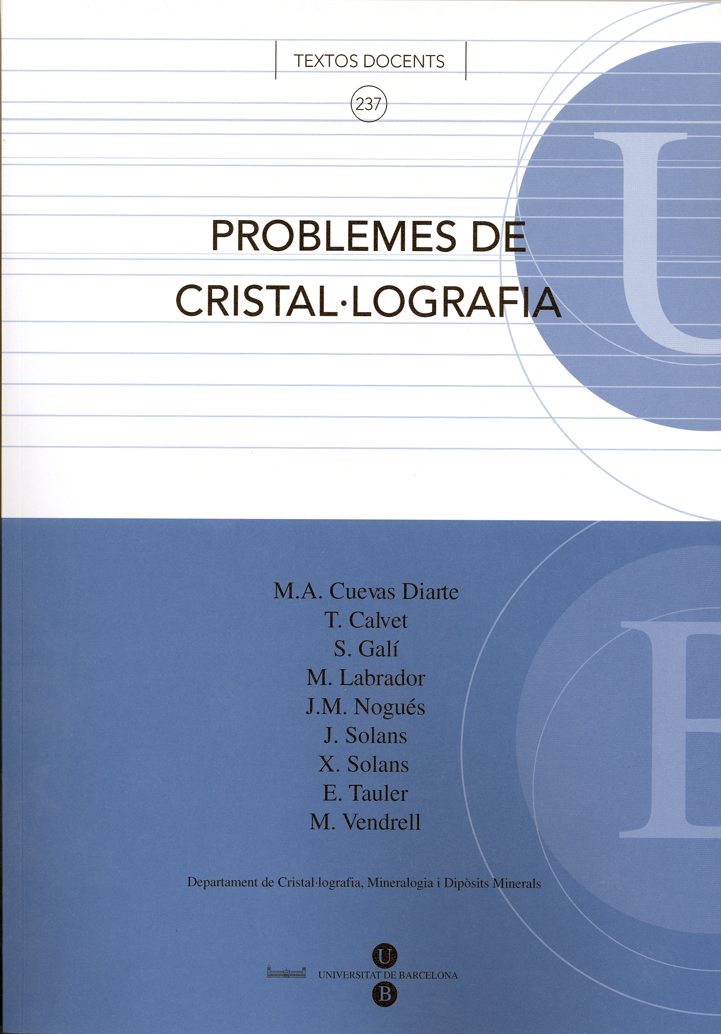 La Cristal·lografia és una ciència interdisciplinària amb connexions amb la mineralogia, la química, la física, la farmàcia, la biologia, i la ciència i enginyeria dels materials, entre d’altres. Els manuals docents són abundants i variats quant al seu contingut i el seu nivell. No obstant això, es troba a faltar problemes resolts que ajudin a entendre millor els conceptes teòrics. Aquest manual pretén omplir aquest buit a partir de l’experiència de molts anys de docència dels professors del Departament de Cristal·lografia, Mineralogia i Dipòsits Minerals de la Universitat de Barcelona.