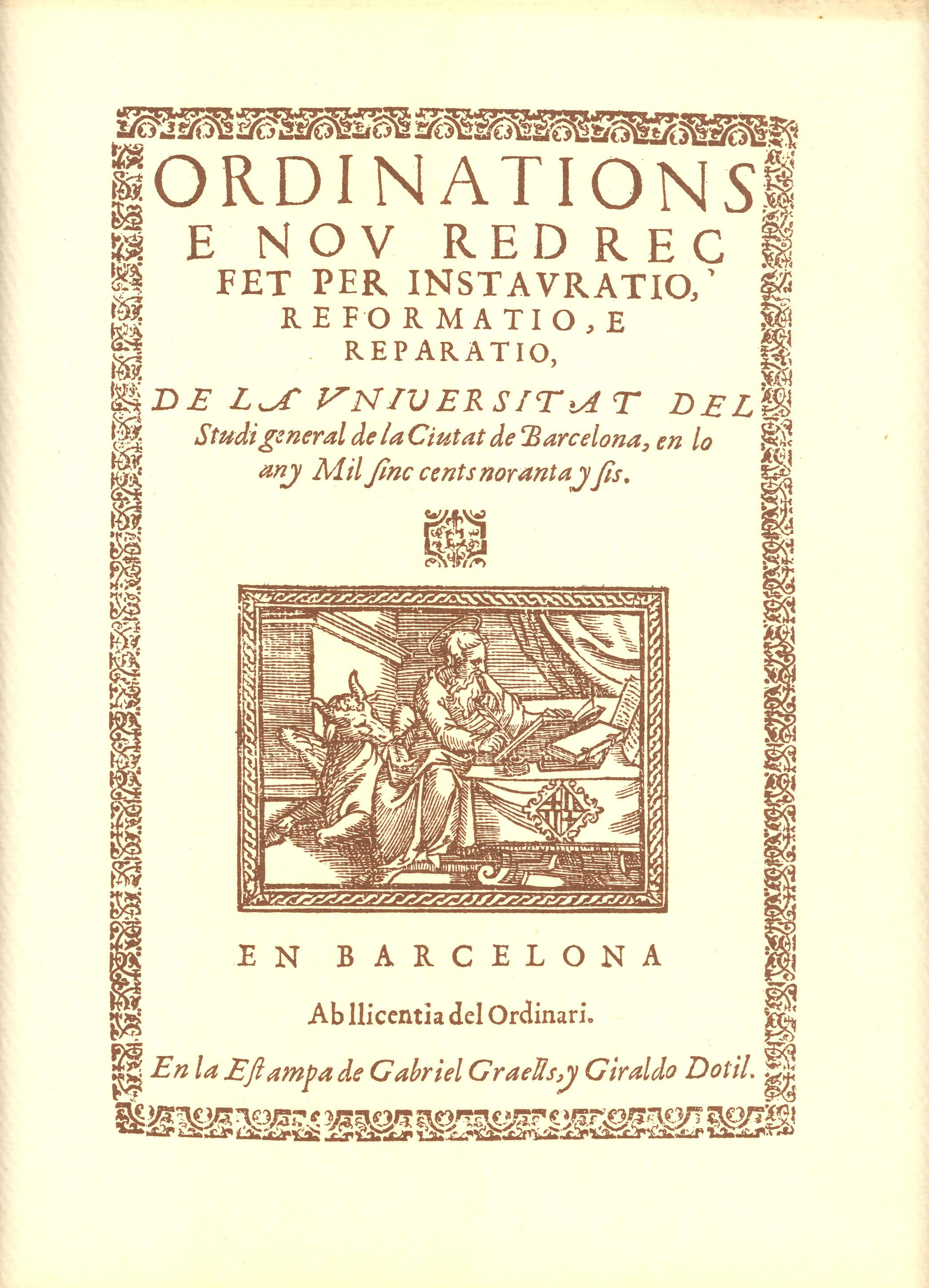 El presente volumen contiene una reproducción facsímil de las "Ordinations del Studi General de la Ciutat de Barcelona", publicados en 1596, y que recopilaban las normas por las que se regía el funcionamiento y la organización de lo que hoy conocemos como Universidad de Barcelona.