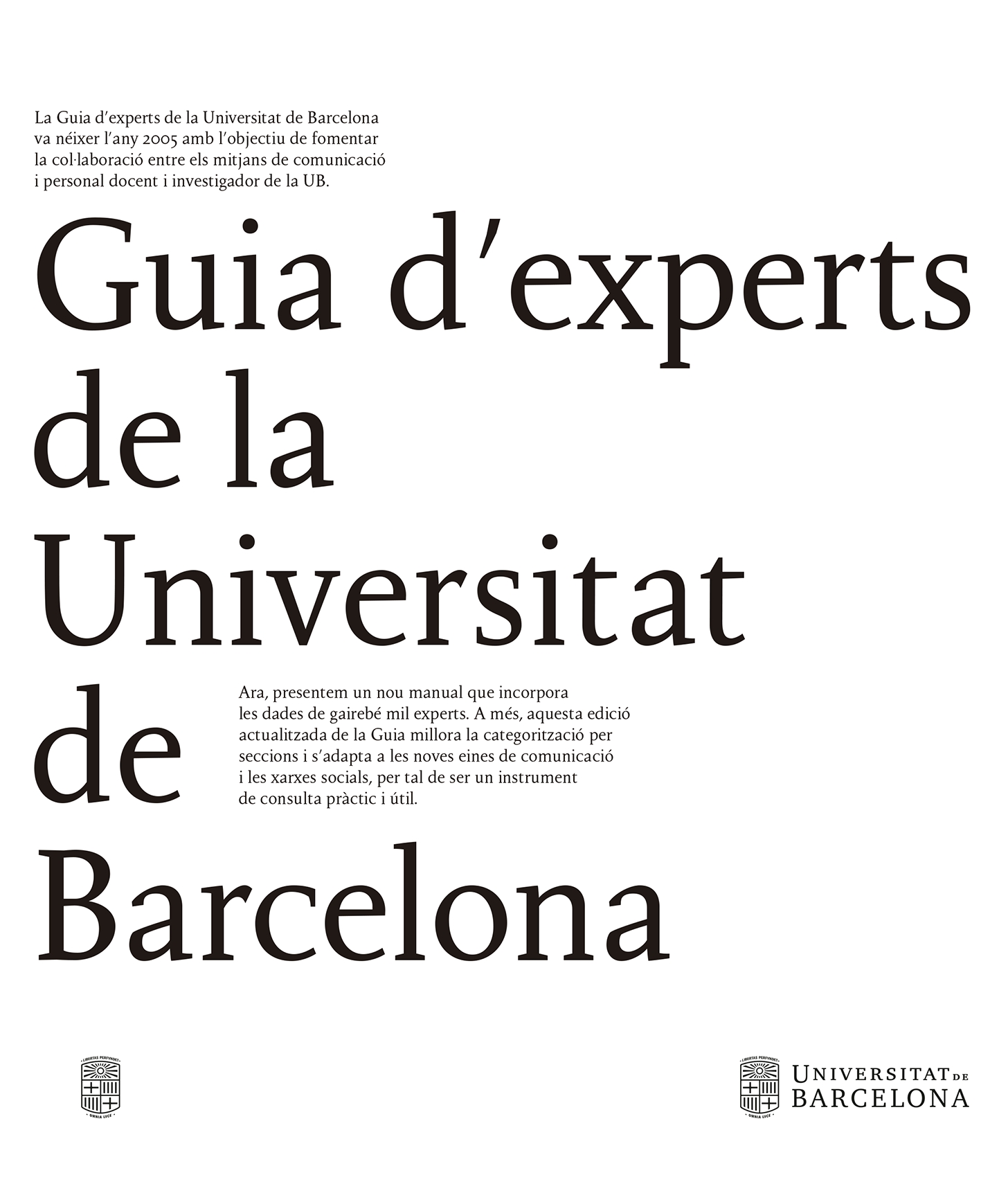 La Guia d’experts de la Universitat de Barcelona va néixer l’any 2005 amb l’objectiu de fomentar la col·laboració entre els mitjans de comunicació i personal docent i investigador de la UB. Ara, presentem un nou manual que incorpora les dades de gairebé mil experts. A més, aquesta edició actualitzada de la Guia millora la categorització per seccions i s’adapta a les noves eines de comunicació i les xarxes socials, per tal de ser un instrument de consulta pràctic i útil.